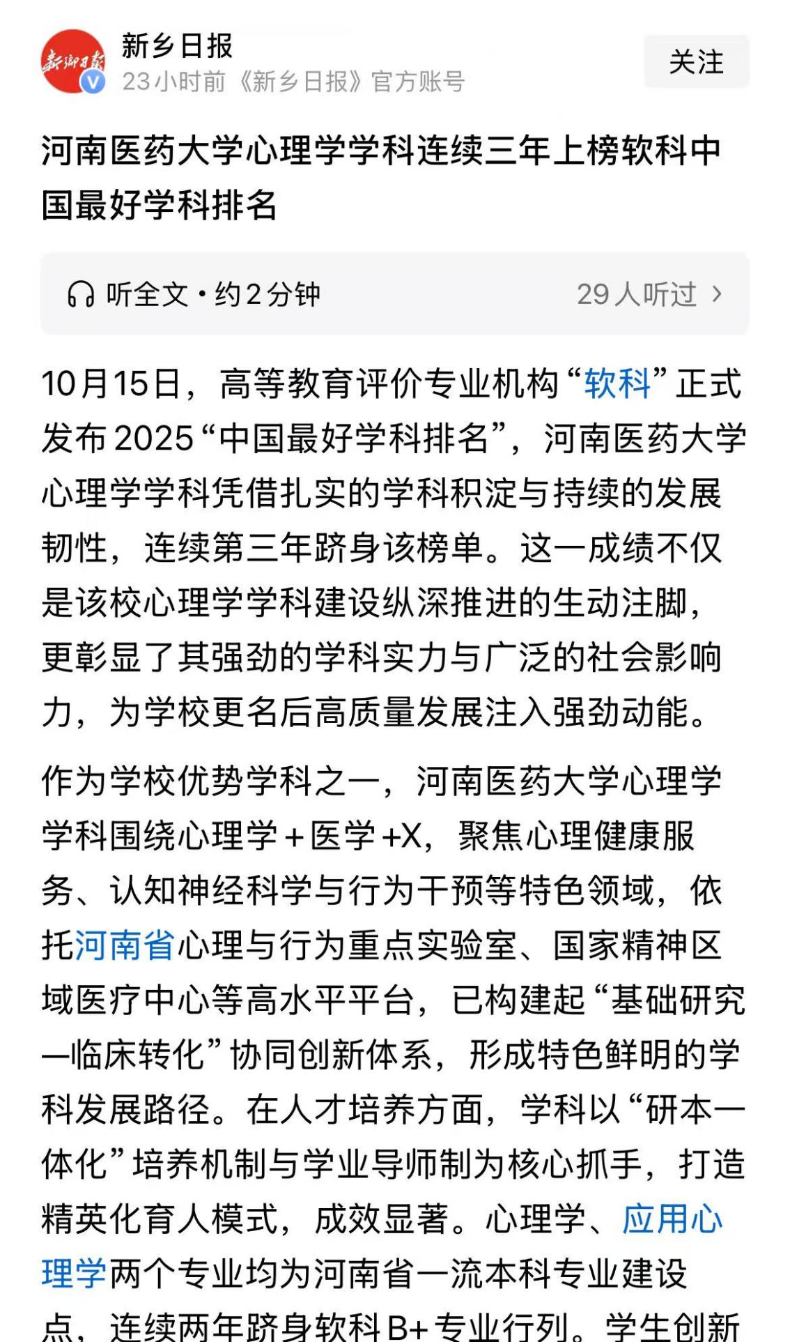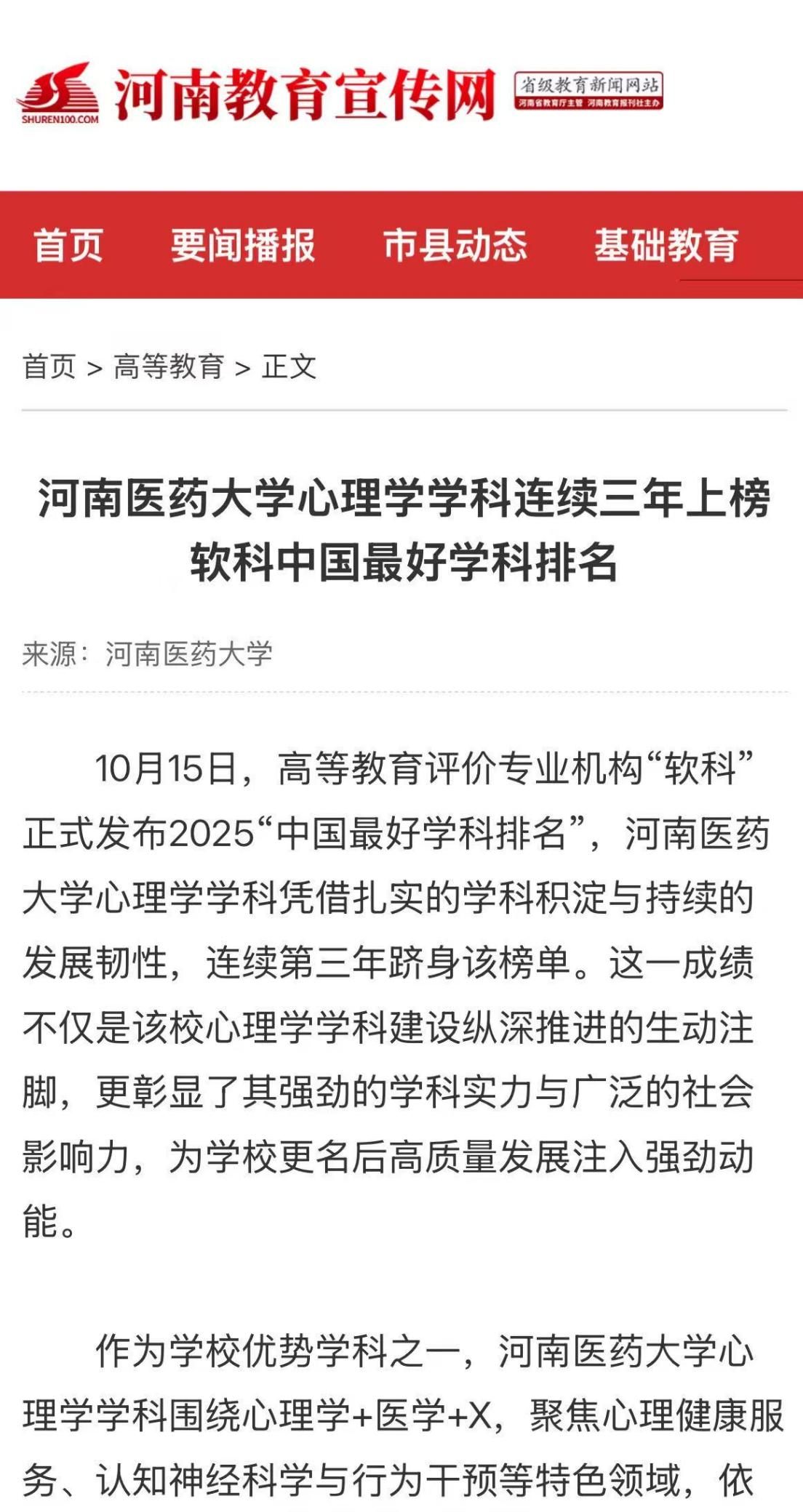日前,高等教育评价专业机构“软科”正式发布2025“中国最好学科排名”,我校心理学学科凭借扎实的学科积淀与持续的发展韧性,连续第三年跻身该榜单。这一成绩不仅是该校心理学学科建设纵深推进的生动注脚,更彰显了其强劲的学科实力与广泛的社会影响力,为学校更名后高质量发展注入强劲动能。顶端新闻、大河报•豫视频、大河报新乡新闻、今日头条、新乡日报、河南教育宣传网等多家媒体报道。