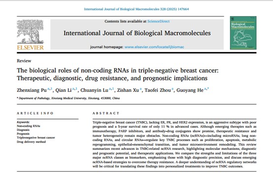 近日,我院2022级本科生蒲珍翔、李倩、鲁传银在学术研究领域取得重要成果——以并列第一作者身份,在国际知名期刊《InternationalJournalofBiologicalMacromolecules》发表题为“Thebiologicalrolesofnon-codingRNAsintriple-negativebreastcancer:Therapeutic,diagnostic,drugresistance,andprognosticimplications”的综述论文,我院贺国洋教授担任通讯作者。