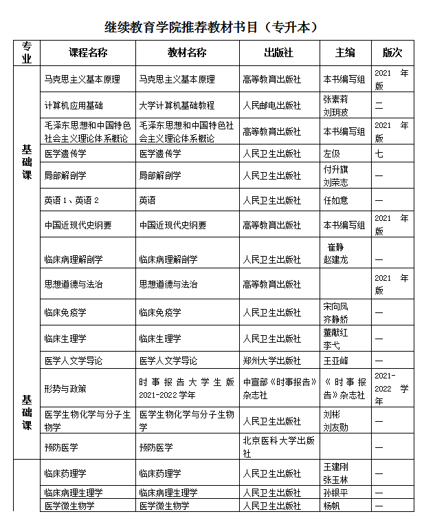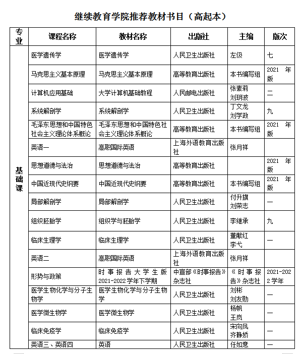 根据2021年河南省审计厅对我校审计工作的有关整改要求,为扎实做好整改工作,按照《河南省普通高等学校教材管理实施细则》及我校有关文件精神,依据《华亿在线手机版(大中国区)继续教育学院关于选用教材及禁止收取教材费的通知》具体要求,各校外教学点只能按照继续教育学院提供的推荐教材书目,让学生本人根据自身意愿自行购买,学校及校外教学点不负责订购教材和收取及代收取教材费用,望务必遵照执行。现将推荐书目列表如下: