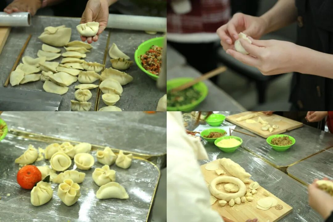 首先迎来的的是包饺子环节,同学们被随机分为7组。在主持人的引导下,各小组成员迅速投入制作。食堂瞬间变成了“饺子”的战场,热闹非凡。同学们的想象力丰富,元宝形、月亮形、花朵形等各式各样的饺子纷纷亮相,每个饺子都形态各异,让人眼前一亮。
