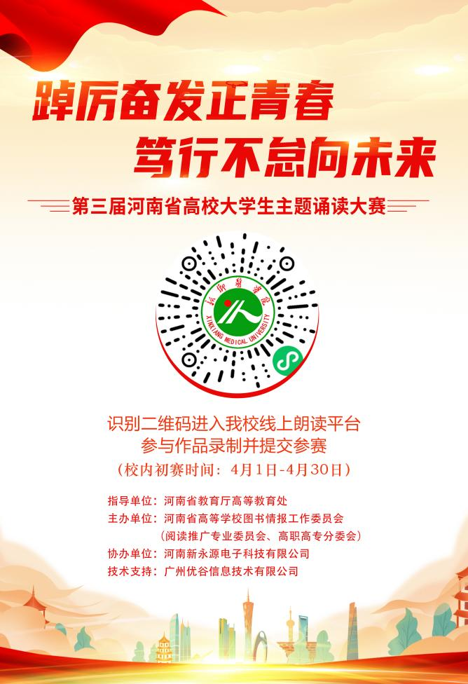 为落实《关于开展第三届河南省高校大学生“踔厉奋发正青春·笃行不怠向未来”主题诵读大赛活动的通知》(豫高校图工委〔2022〕01 号)文件精神(详见附件),在第27 个“世界读书日”(4 月 23 日)来临之际,我校特举办“踔厉奋发正青春·笃行不怠向未来”主题诵读大赛,现将有关事项通知如下: