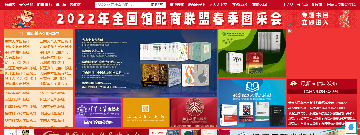 1、主会场:其右上角展示图采会开幕式领导讲话及平台消息发布。其他板块主要展示重点出版社书目,直接点击出版社名称即可进入选书界面。
