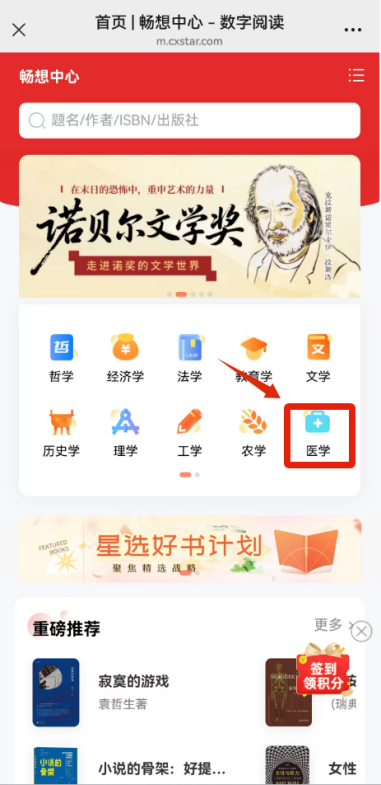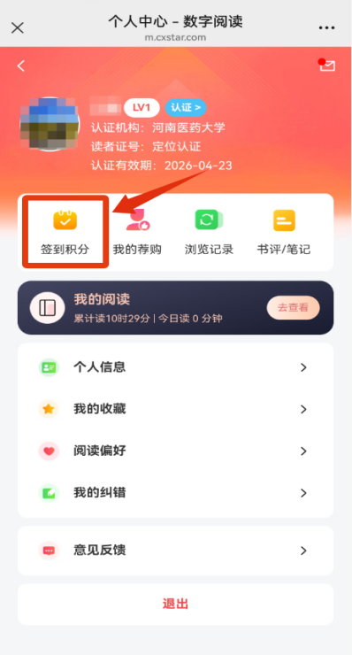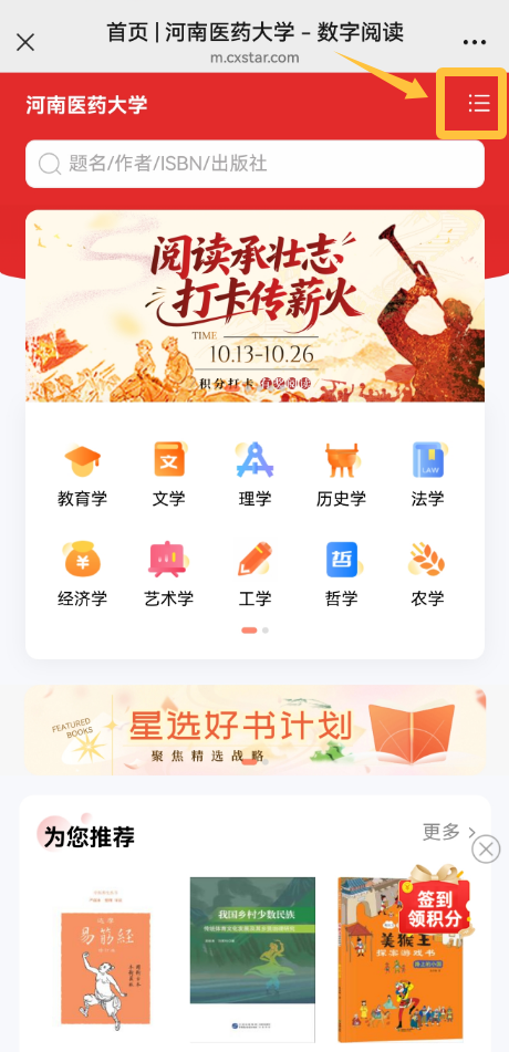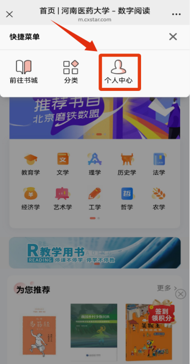 成功认证为河南医药大学图书馆畅想之星读者后-进入阅读平台页面,选择相应电子书开始PDA在线直接采购和阅读使用;登录后点击个人中心可查看记录和签到积分情况。