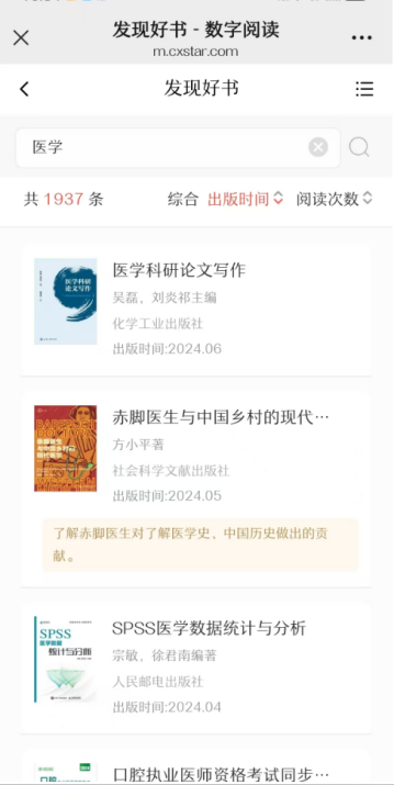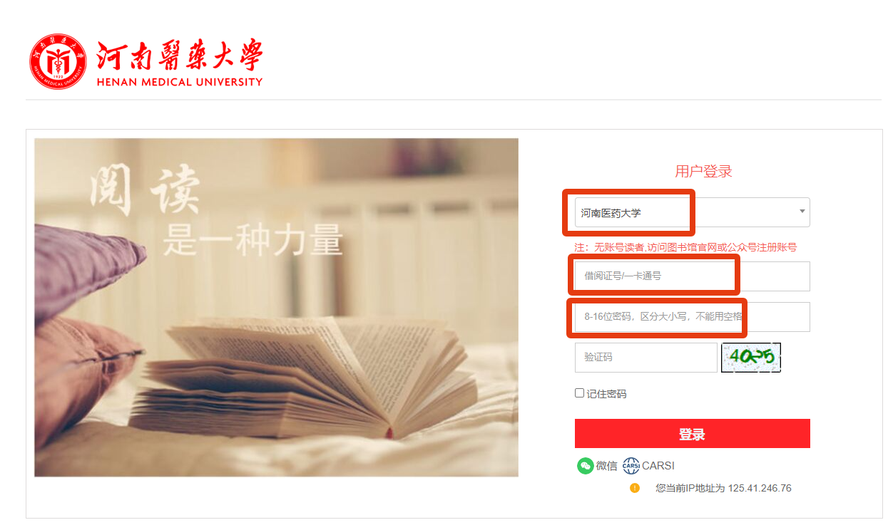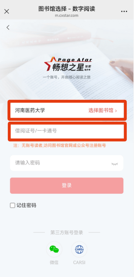 输入PC端网址:https://www.cxstar.com/xxyxy.htm(或者通过河南医药大学图书馆官方网站“资源中心”→“电子图书/期刊”→畅想之星电子书)进入登录页面,在“选择图书馆”中选择“河南医药大学”→输入“读者证号(一卡通账号)”→输入默认初始密码“123456”认证成功,进入首页→开始阅读电子书。