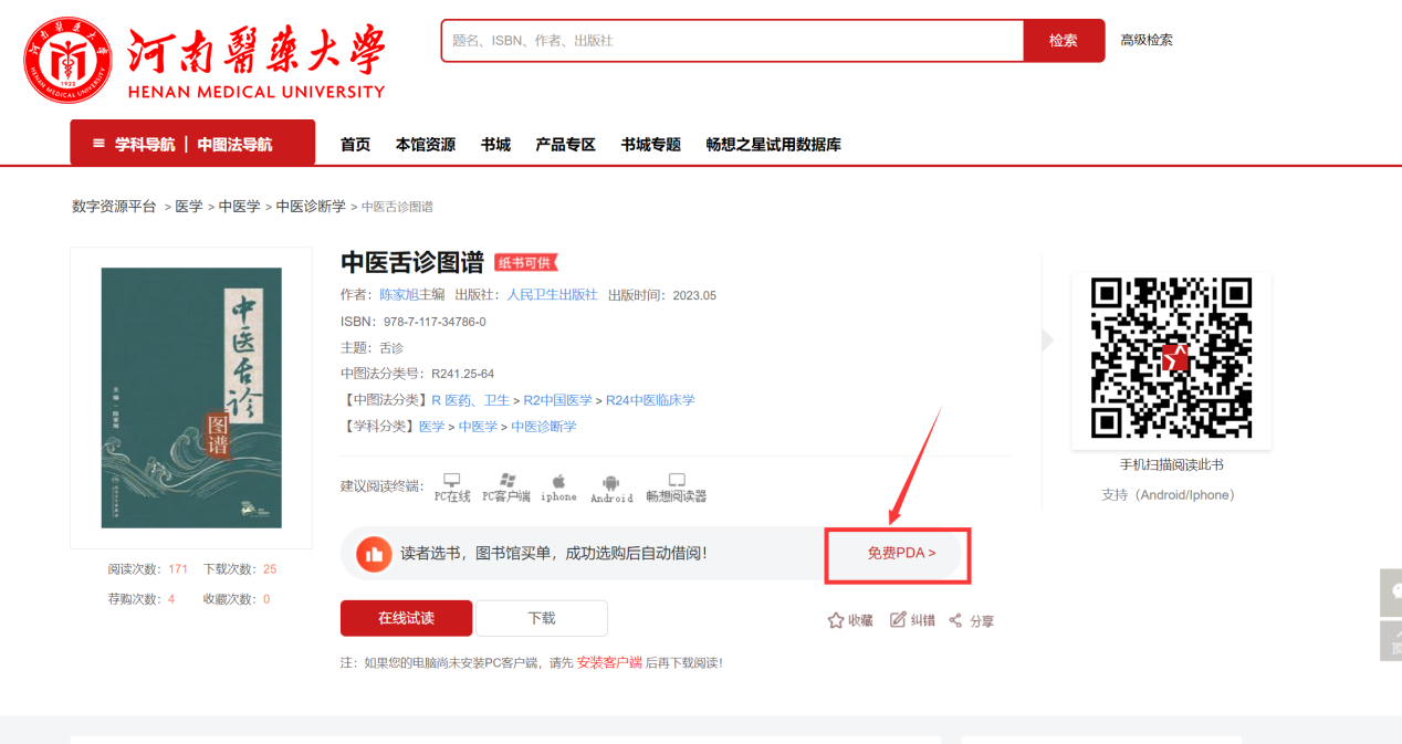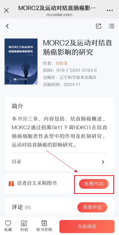 (3)书城资源中本馆未正式购买的电子书,点击进入图书详情页,可以“在线试读”,读者感兴趣的电子书可以点击“免费PDA”替图书馆决策购买。