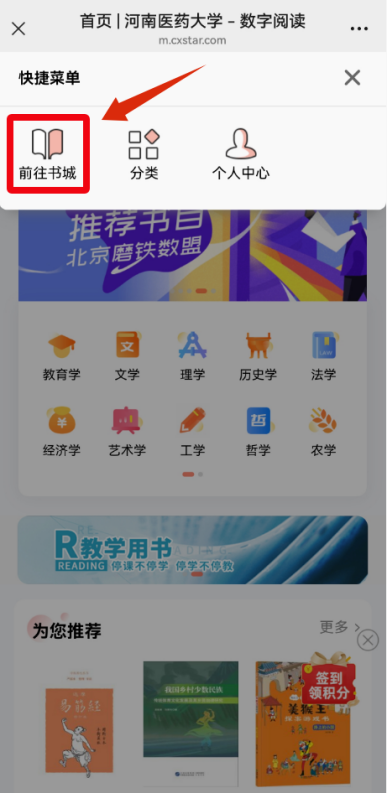 (2)在首页导航栏直接点击“书城专题”或“书城”栏目,即可试读相关本馆未开通试用数据库中每本电子书整书页数的10%-30%。