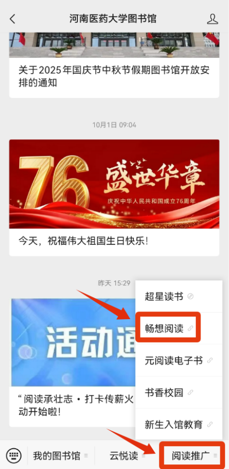 微信关注“河南医药大学图书馆”微信公众号→阅读推广→畅想阅读,点击畅想之星按钮进入电子书系统微信端首页。