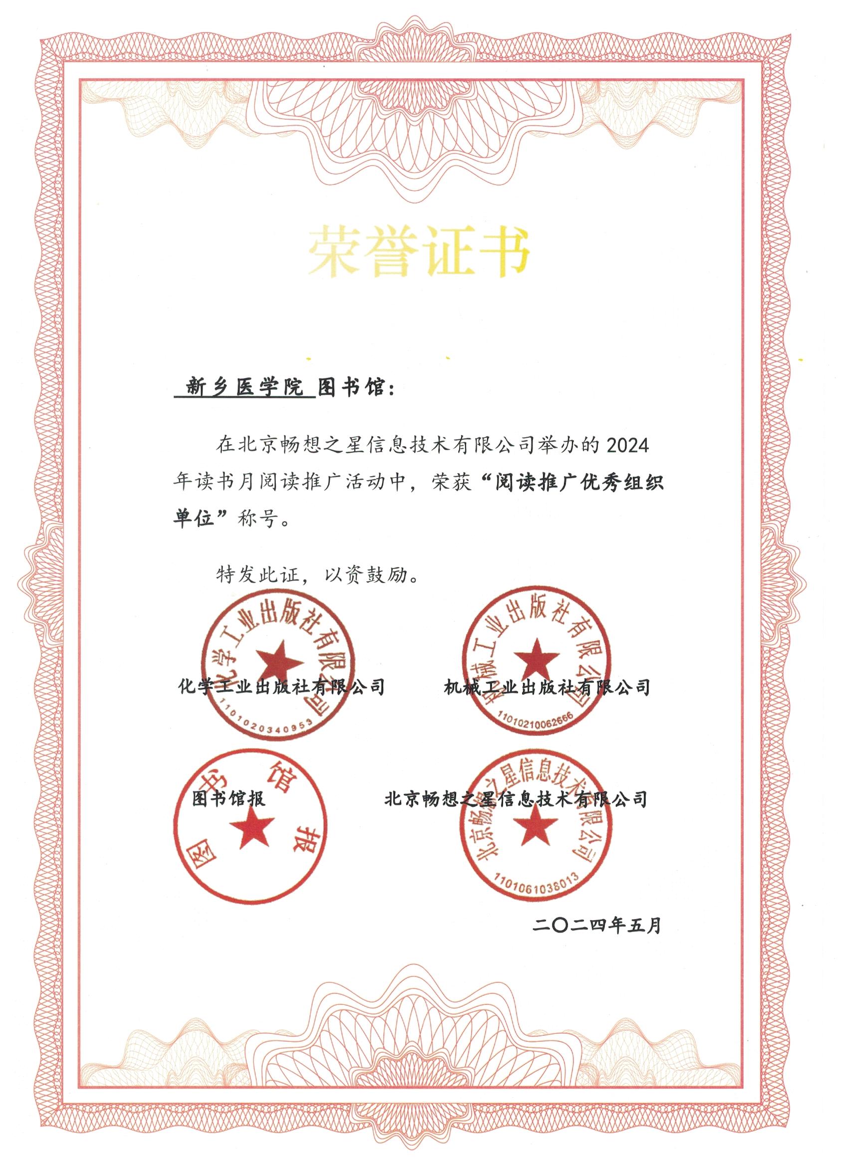 近日,我校图书馆在2024年读书月阅读推广活动中表现突出,荣获由图书馆报、机械工业出版社、化学工业出版社以及畅想之星馆配电子书平台联合颁发的“阅读推广优秀组织单位”称号荣誉证书。
