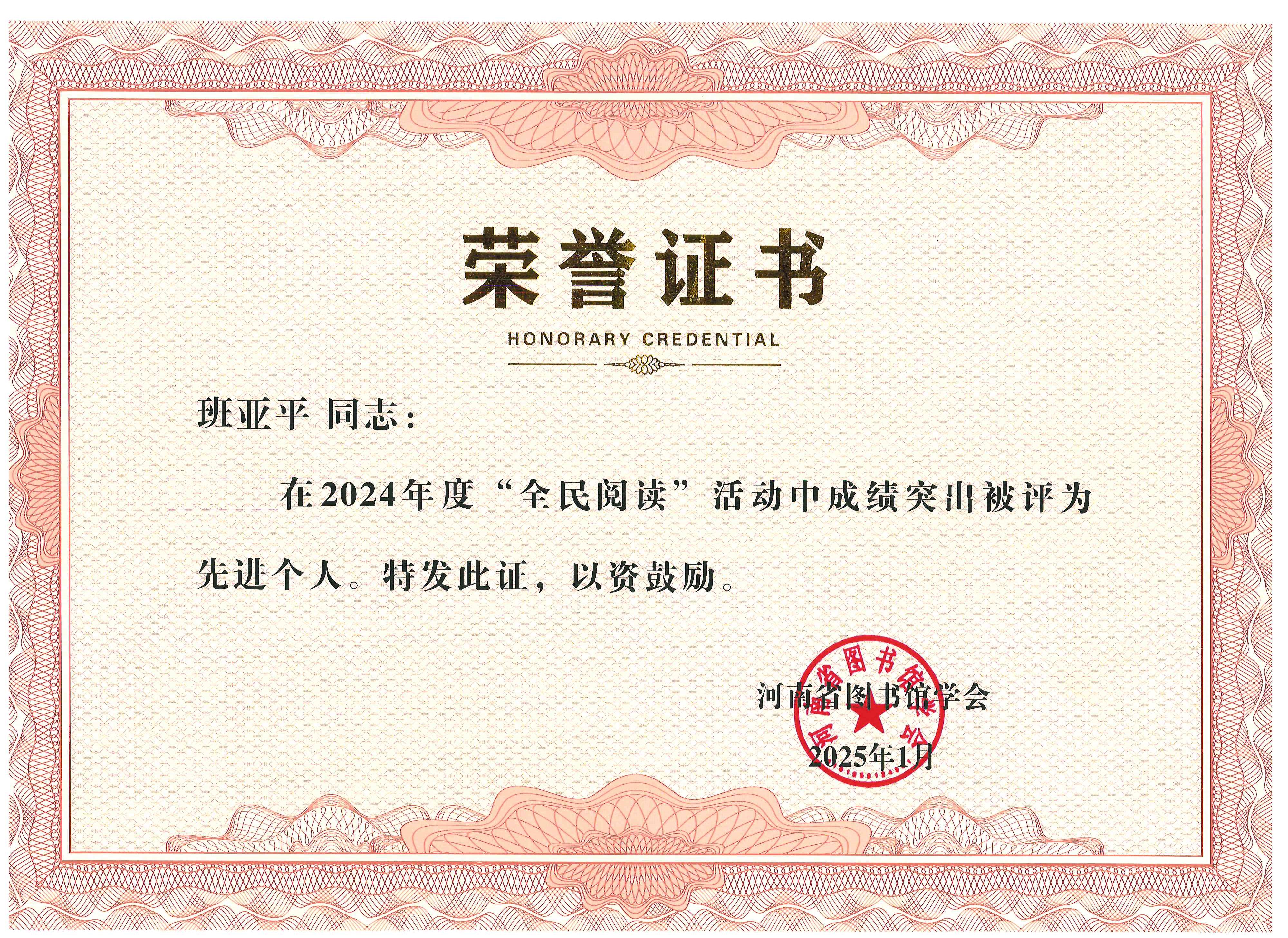 近日, 河南省图书馆学会下发《关于表彰2024年度“全民阅读”活动先进单位和先进个人的通知》,我校图书馆荣获2024年度“全民阅读”活动先进单位称号,班亚平荣获2024年度“全民阅读”活动先进个人称号。