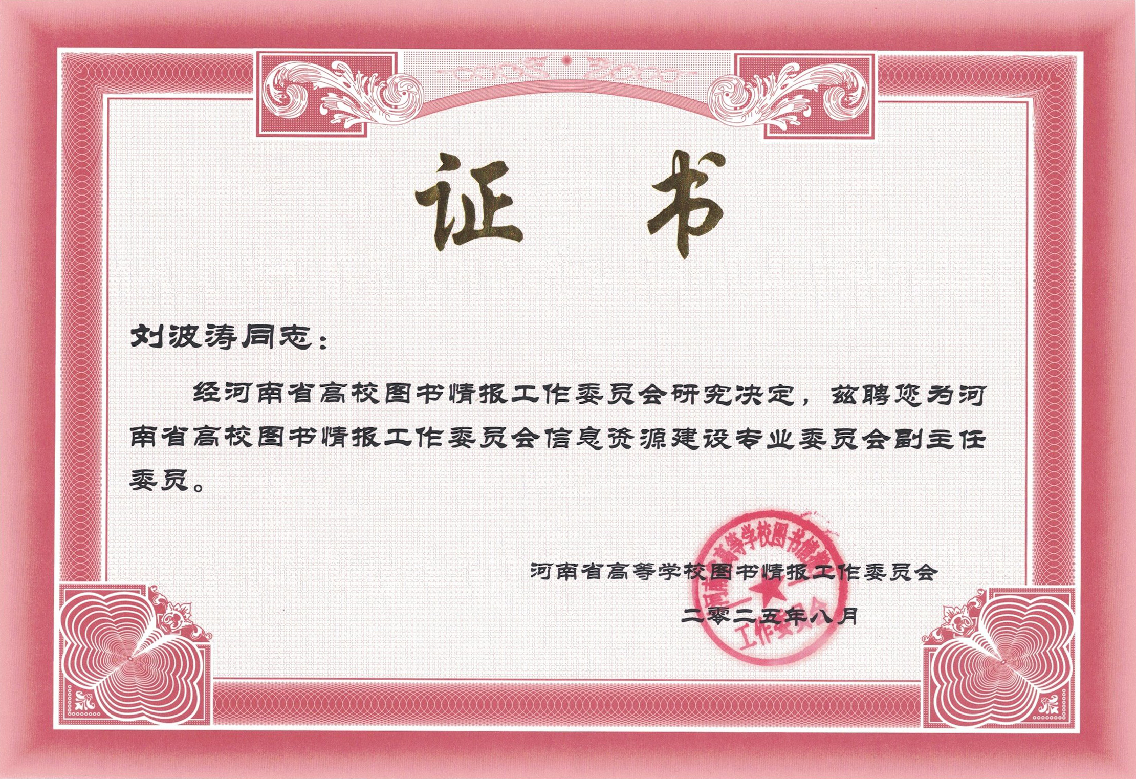 会上,与会领导向省高校图工委信息资源建设专业委员会新任委员颁发聘任证书。我校图书馆馆长刘波涛受聘河南省高校图书情报工作委员会信息资源建设专业委员会副主任委员。