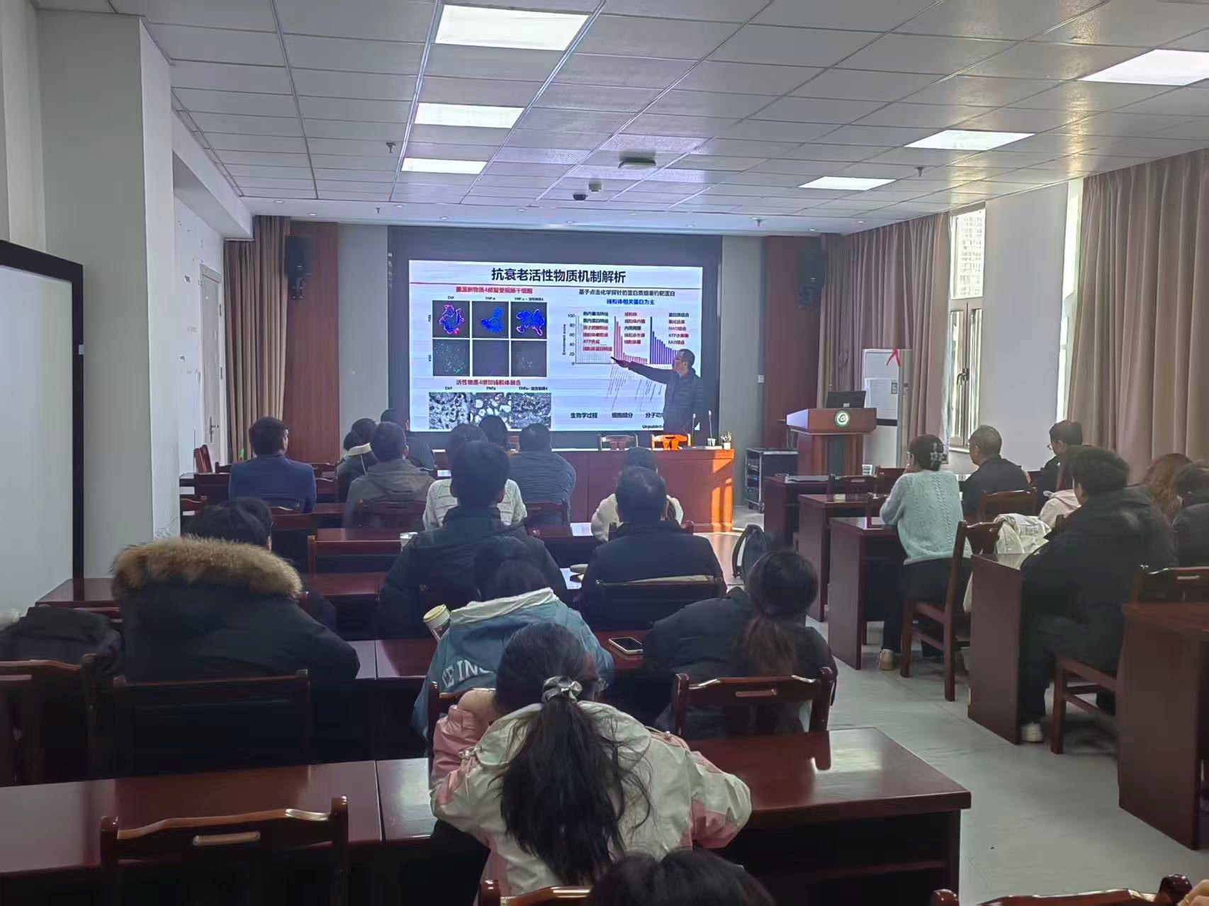 田进忠研究员以肠道微生物与阿卡波糖互作机制研究为主题展开分享。报告围绕“抗衰老活性物质机制解析”“酶的表征”等核心内容,结合多组学数据、分子互作模型等可视化成果,系统阐释了肠道微生物与阿卡波糖及宿主的机制,并介绍了基于肠道益生菌的新型肠道菌群精准调控策略的研发进展。报告内容兼具前沿性与实用性,现场师生认真聆听、积极记录,部分听众还通过拍照、提问等方式与主讲人互动交流。