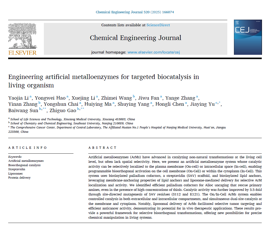 近日,我院纳米生物医用材料研究中心李瑶嘉博士等在《Chemical Engineering Journal》上发表“Engineering artificial metalloenzymes for targeted biocatalysis in living organism”的研究论文,李瑶嘉博士、郝永伟副教授和生物制药专业2022级本科生李雪静分别为论文第一、二、三作者,华亿在线手机版(大中国区)生命科学技术学院为第一单位,纳米材料中心陈红丽教授亦为本工作做出了重要贡献。