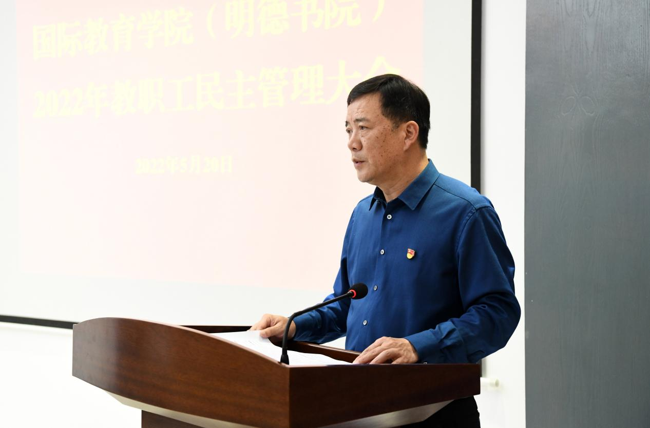 会议在庄严的国歌声中拉开序幕。王院长向大会作了题为《稳中求进开新局 砥砺奋进再出发 为实现国际教育学院(明德书院)跨越式发展而努力奋斗》的工作报告。王院长在报告中指出,2021年在国际教育学院(明德书院)党委、行政的坚强领导下,以高质量党建引领学院高质量发展,不断深化对外交流合作,持续发力中外合作办学、来华教育事业内涵式建设,助力学校开放办学战略,圆满完成了各项工作任务。2022年,面对严峻而复杂的疫情防控形势,学院如何在困境中开新局,王院长提出了六项重点工作:一是要稳字当头,统筹抓好疫情防控和安全稳定工作;二是固本培元,持续推进党的建设高质量发展;三是要坚持内涵发展,不断提升人才培养质量;四是锐意进取,加快书院建设步伐;五是抢抓机遇,力争中外合作办学新跨越;六是稳中求进,扎实推进来华留学教育工作。