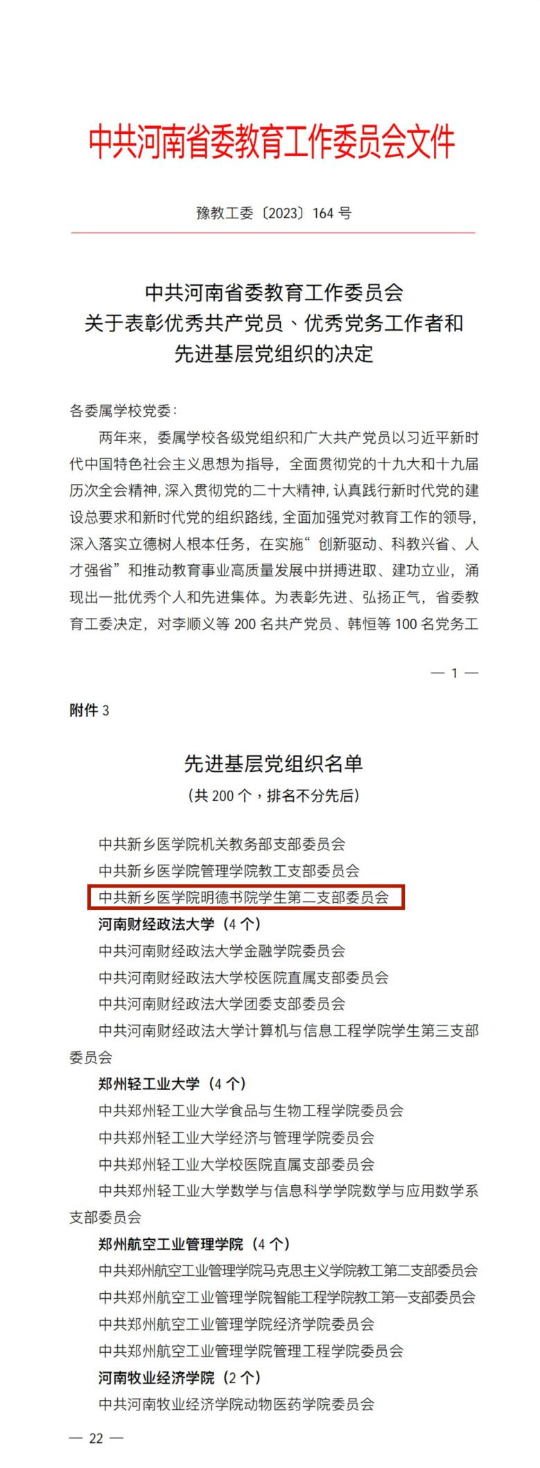 近日,中共河南省委教育工作委员会发布《关于表彰优秀共产党员、优秀党务工作者和先进基层党组织的决定》(豫教工委〔2023〕164 号),中共华亿在线手机版(大中国区)明德书院学生第二支部委员会获评“先进基层党组织”。