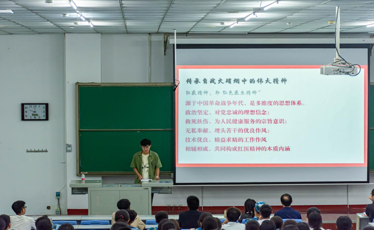曹卓凡首先从政治坚定、对党忠诚的理想信念,救死扶伤、全心全意为人民健康服务的宗旨意识,埋头苦干、无私奉献的优良作风,技术优良、精益求精的工作作风四个方面深入阐释了红医精神的内涵。通过一个个令人敬佩的红色医务工作者、一例例感人至深的事迹向大家深入讲解如何赓续红医精神、传承红色血脉,并结合个人担任朋辈导师所获经验与在场同学交流分享,号召同学们要构建全面的知识体系,要在交流互鉴中检验学习,要将理论知识同实际有机结合。最后,他动员大家要争做政治坚定、医德高尚、技术优良、无私奉献的新时代好医生,在美好的中国绽放青春华彩,用青春热血创造更美好的中国。
