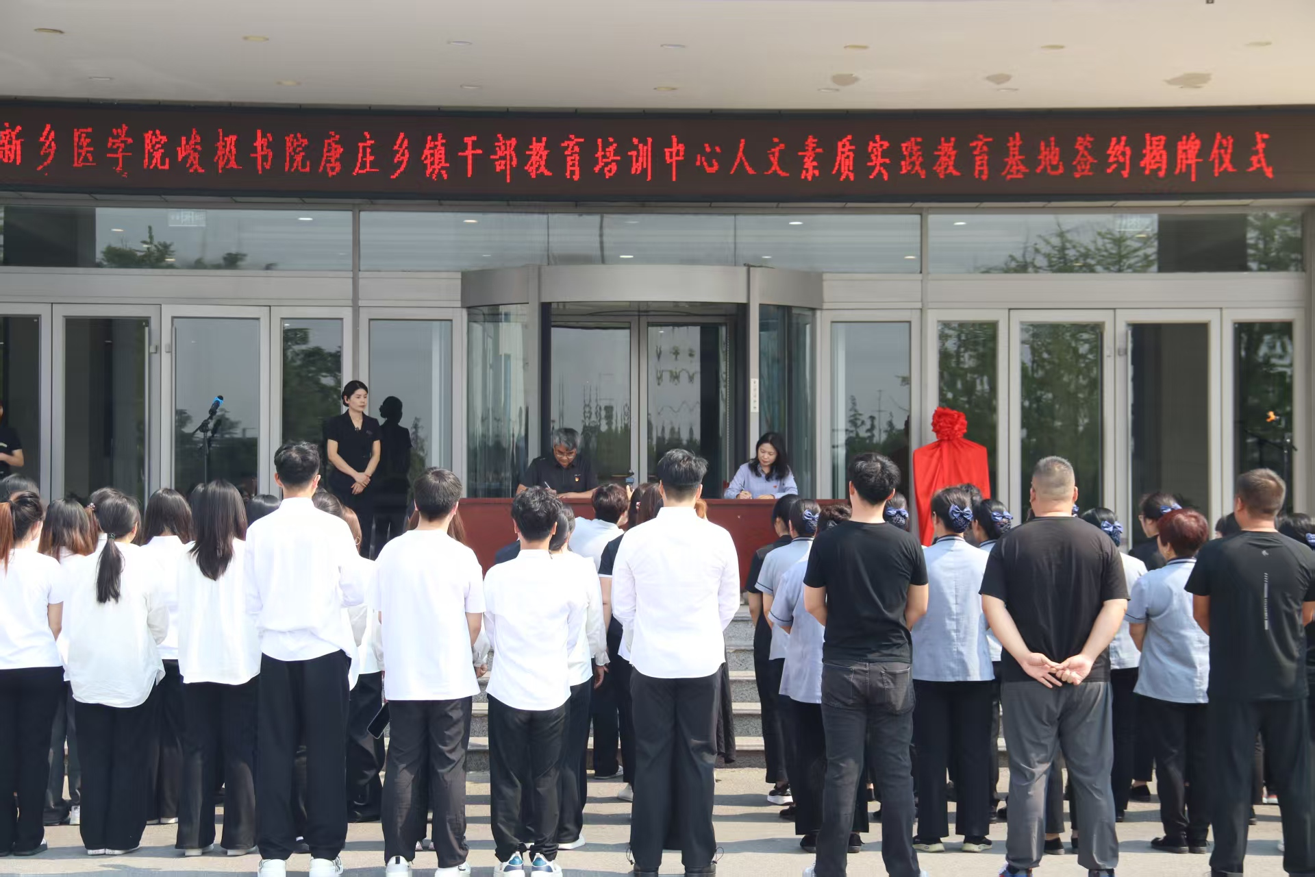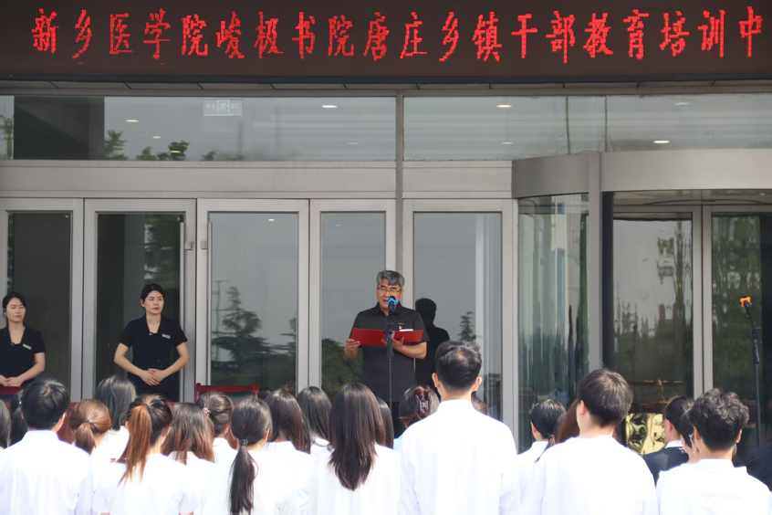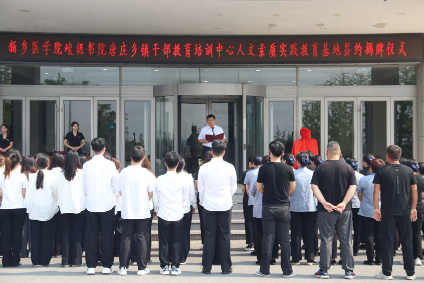 仪式伊始,主持人峻极书院辅导员李佳音同志向各位领导和嘉宾的到来表示诚挚的问候。新乡市唐庄乡镇干部教育培训中心是经中组部备案的全国72家党性教育基地之一,为国家“革命老区乡村振兴研学基地”、中央编办定点培训单位、河南省“首批脱贫攻坚乡村振兴交流基地”、河南省“关心下一代教育基地”、新乡市中共党史教育基地等。中心以习近平新时代中国特色社会主义思想为指引,坚守“情系基层发展,服务干部成长”的办学定位,依托当地厚重历史文化、高校人才资源及特色党建优势,推动“红色传统基因”与“绿色发展动能”深度融合。