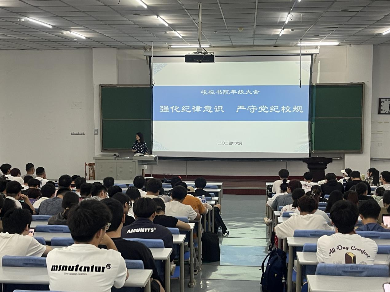 本次主题教育会议首先由书院党委副书记赵民结合党纪学习主题教育内容,为同学们强调纪律意识对于大学生成长成才的重要性。同时,各年级辅导员结合校规校纪和具体案例,向同学们阐述了违反纪律的严重后果,并再次强调了诚信在大学生活中的重要性。