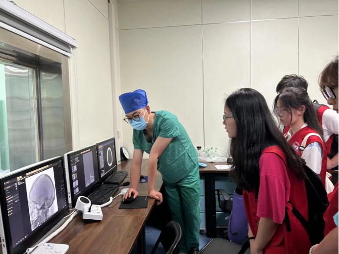 随后,崔老师分批次带领同学们见习了X射线、口腔CT、介入手术、彩超、磁共振等医学影像设备,并就仪器的使用、维护等相关临床技能知识做出了详细讲解。