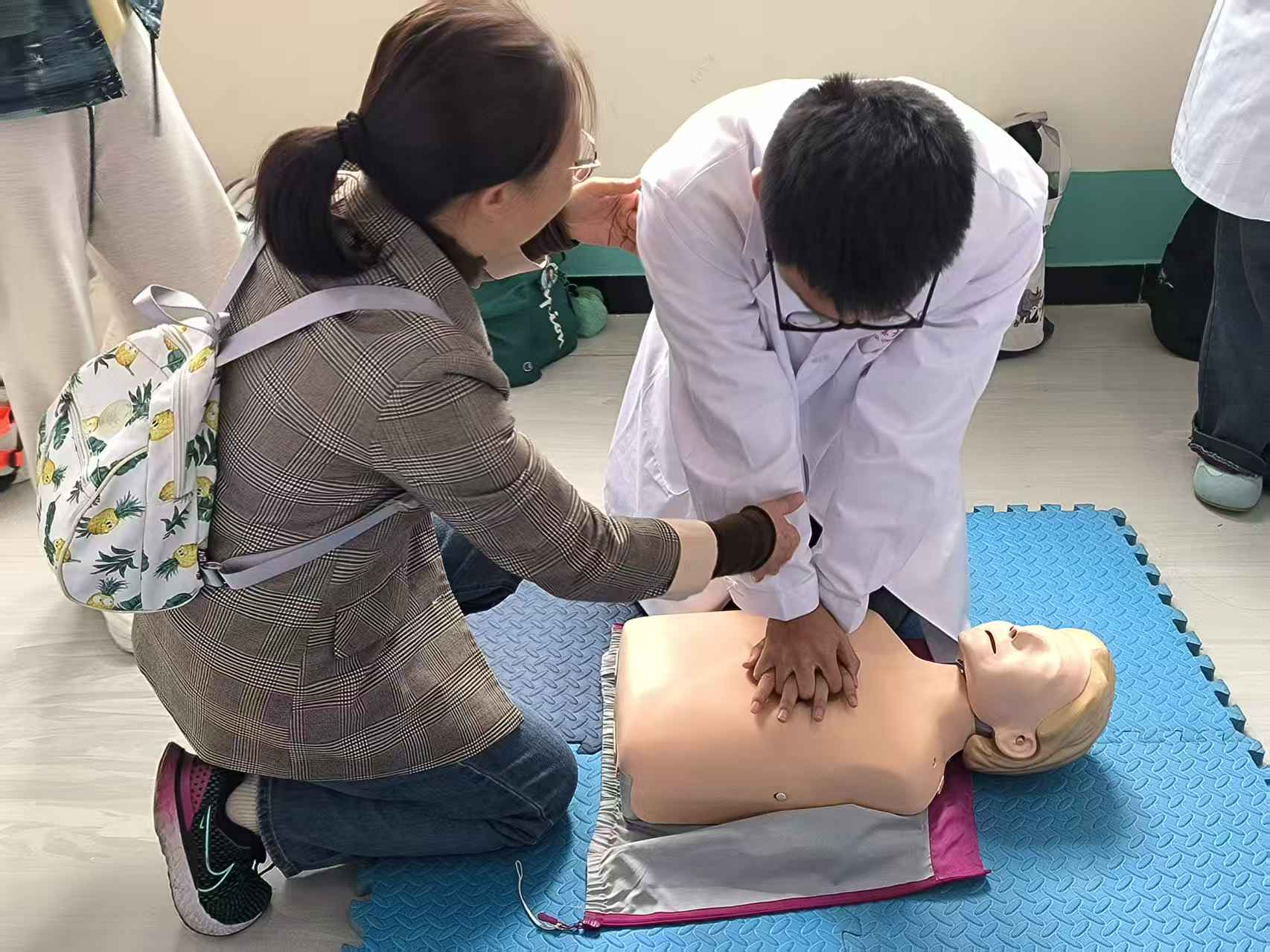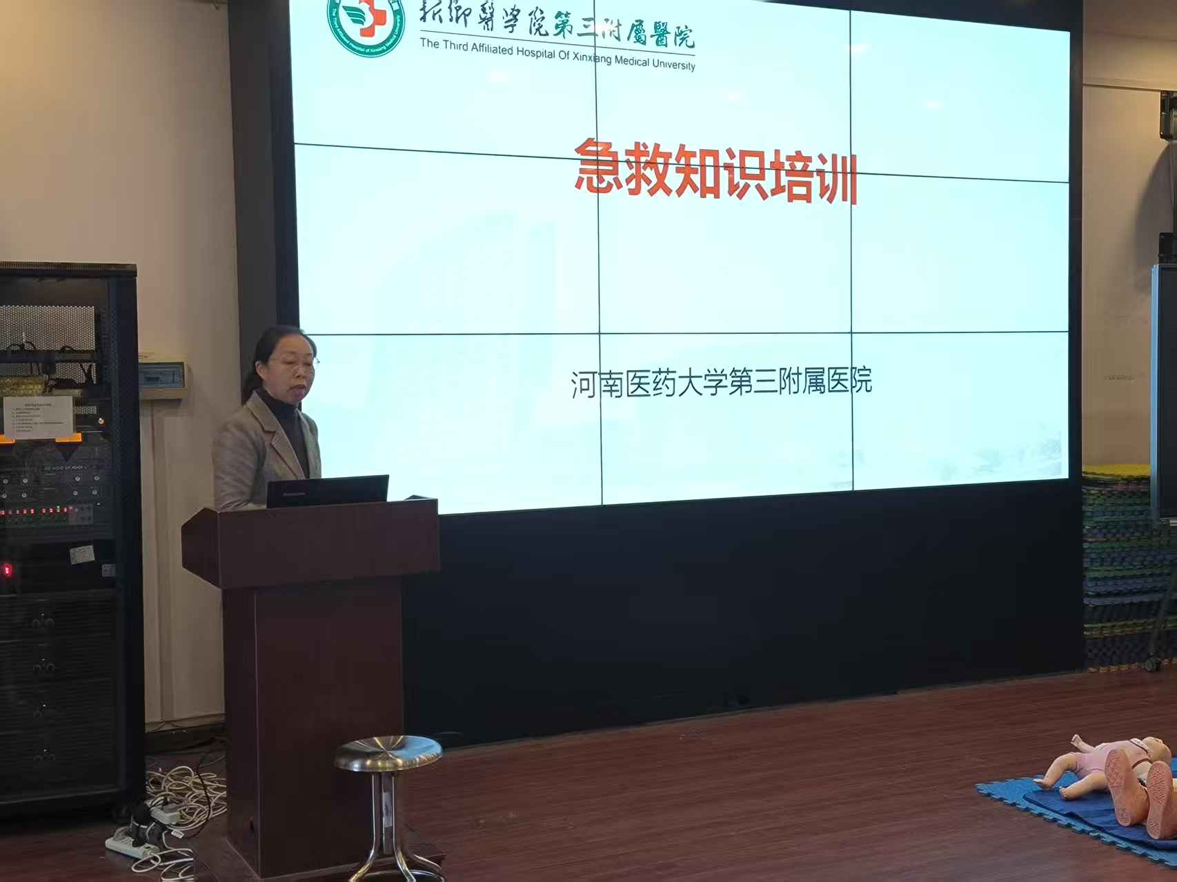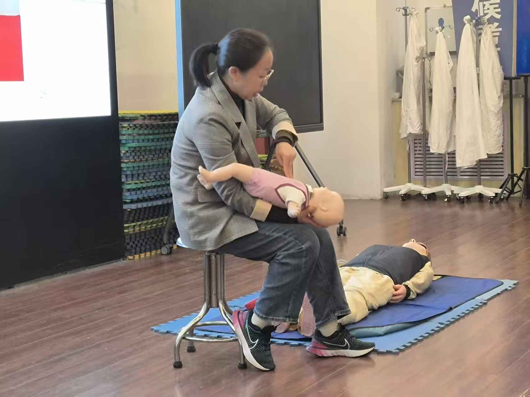 培训伊始,王老师以急救“黄金四分钟” 为切入点,结合真实案例,通俗讲解心肺复苏、AED 使用及海姆立克急救法的核心要点,并借助急救模拟人进行全程示范,将抽象理论转化为实操技能。