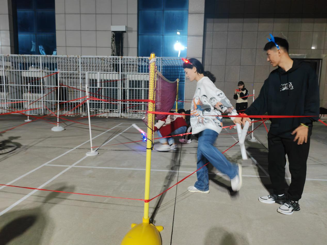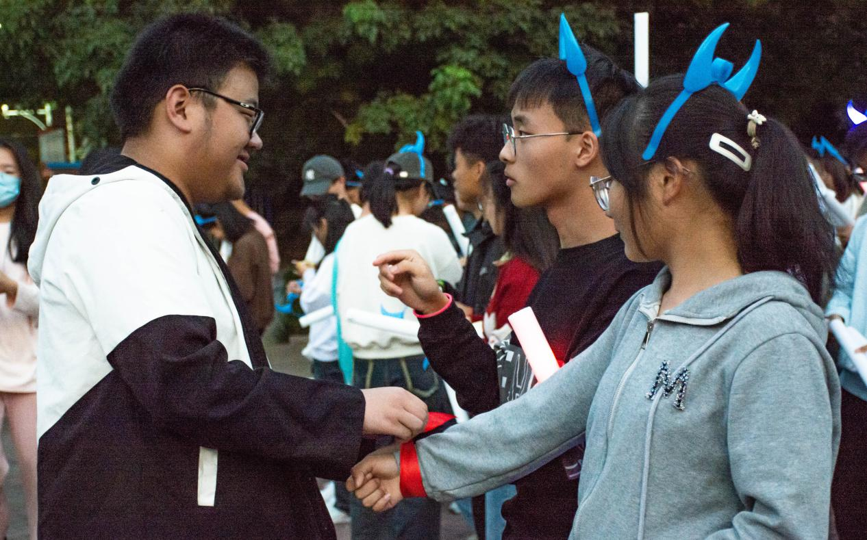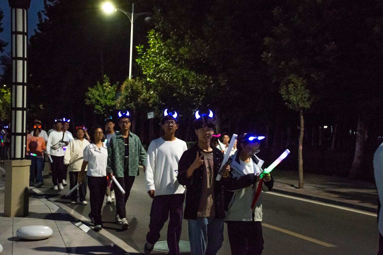 在活动正式开始前,参加比赛的五十组同学早已在此等候。他们在现场工作人员的引导下,有条不紊地进行了签到、领取荧光棒、捆绑丝带等活动流程,前往不同出发点进行游戏打卡。