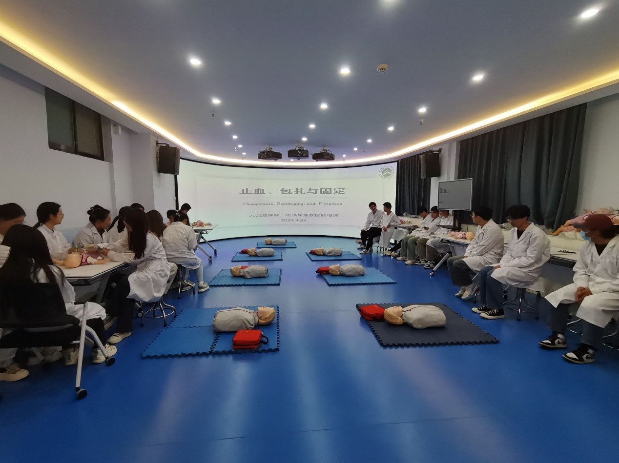 为加强同学们的急救知识素养,提高同学们应对突发情况的紧急救护能力。4月29日我院2022级麻醉一班特邀临床技能培训中心贺玉娟和张红云老师开展“止血包扎与固定”临床急救技能培训,本次活动由班级班委主动策划组织,同学们积极响应,展现出极大的学习热情。
