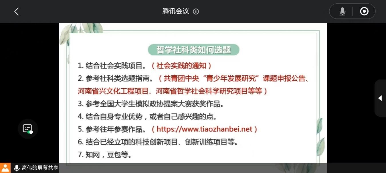 在备赛经验分享环节,高伟结合获奖优秀作品实例分析,从项目选题、研究方法、团队分工等方面为同学们开展详细的备赛指导,为同学们开阔了思路。这些宝贵的经验不仅增强了学生比赛信心,也为他们提供了实际操作的指导。