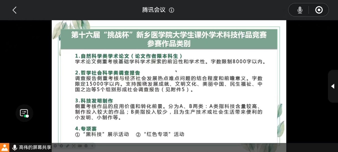 会上,高伟首先强调了此次比赛对学生创新能力培养的重要性,接着全面解读了比赛的内容、参赛材料准备、赛程安排等。
