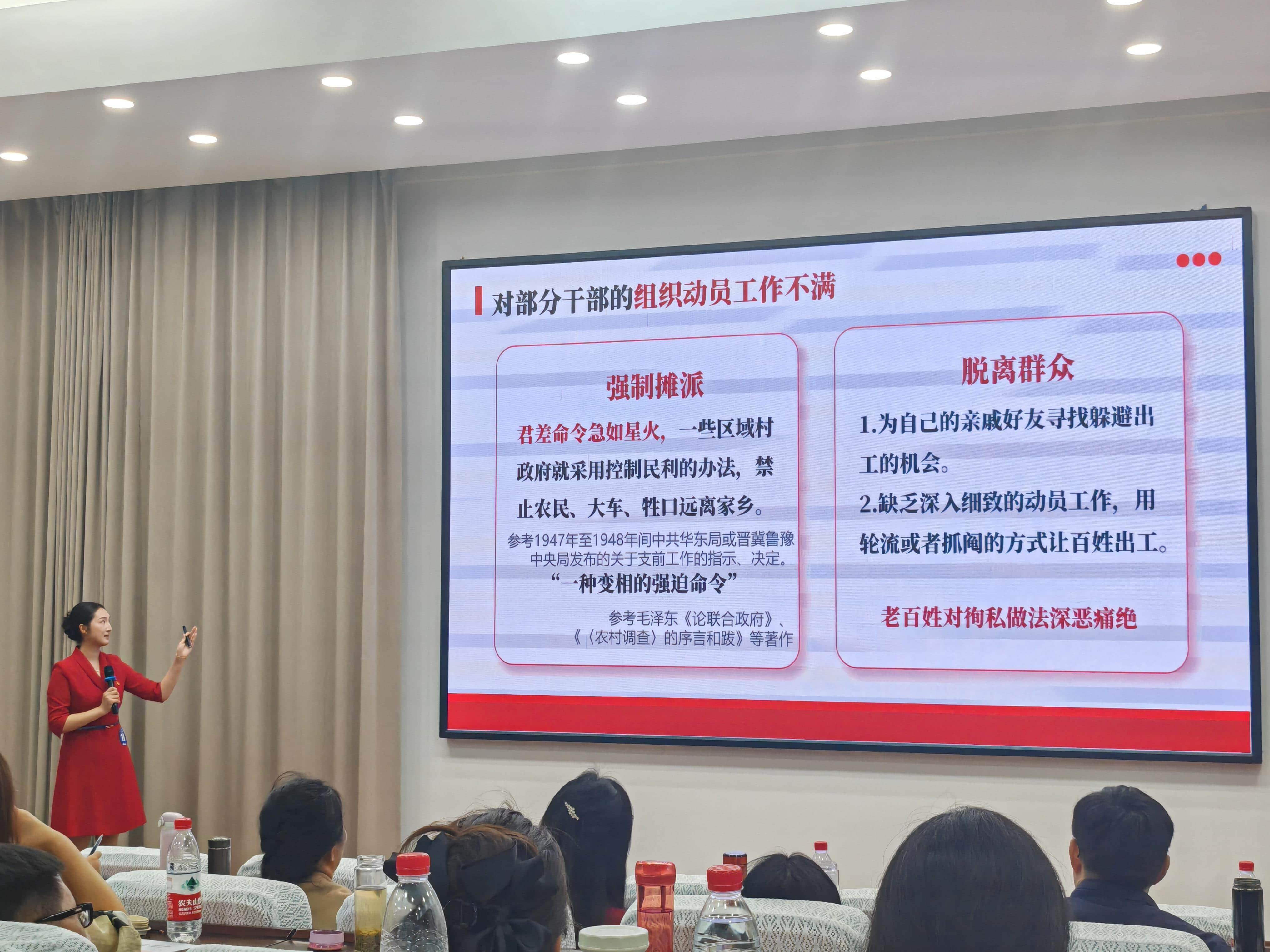 李佳音老师以“支前——淮海战役中的人民战场”为题,从淮海战役中支前民工的历史细节切入,生动阐释了中国共产党一以贯之的人民至上理念,引导学生更加具体、准确地理解党的根本宗旨——“全心全意为人民服务”。授课过程中,她围绕支前工作的“开局之困”“解决之道”“人民之力”以及“思考与总结”四个层面展开讲解,通过多角度设问实现历史与现实的深度对话,既契合统编教材要求,又彰显了思政课的思想性、理论性和亲和力,赢得了现场评委和学生代表的高度评价。