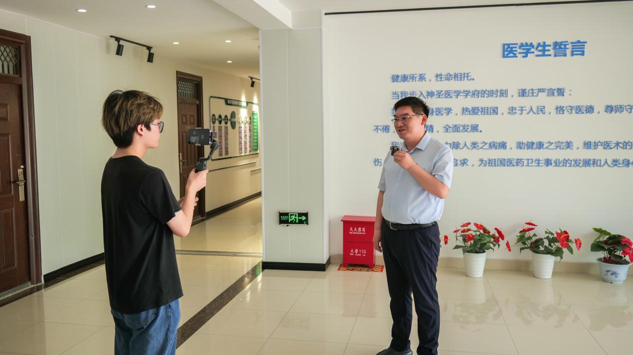 随后,峻极书院辅导员李佳音带领大家参观了书院的社区建设,从书院“素质培养体系”和“管理服务体系”两大体系出发,参观了书院一站式学生服务中心、思政影厅、录播室、排练厅、阅览室、学生宿舍等地。在讲解过程中,随机采访到了菁英医师班获得河南省首届职业生涯规划大赛铜奖的王志宝同学,菁英医师班团支书李培华同学,获得“外研社·国才杯”“理解当代中国”写作大赛国赛铜奖、2023年全国大学生科技词汇大赛一等奖的孙萌钦同学以及以第一作者发表SCI二区论文的吉祥雨同学,学生根据自己在学校中的亲身经历,与直播中的考生及家长分享自己在学校的学习心得。
