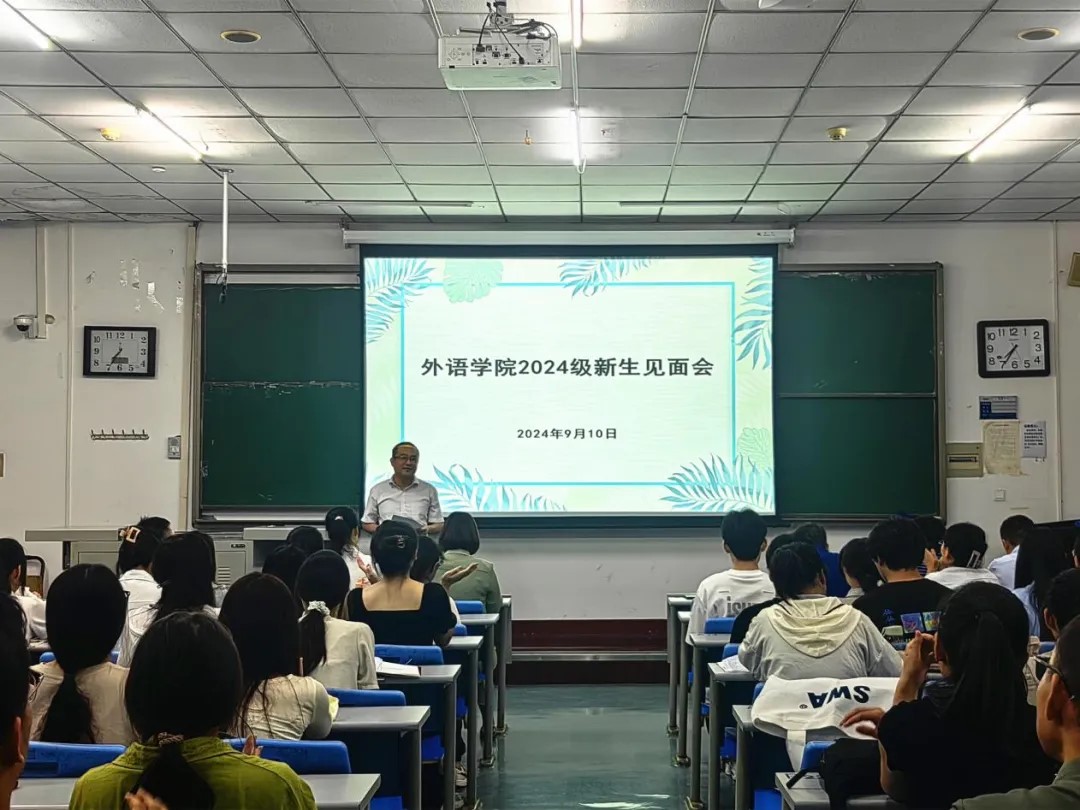 为帮助新生更好的适应大学生活,开启人生新篇章,我院与外语学院双院协同于9月10日晚在3405教室举行2024级新生见面会暨专业入学教育。外语学院党政领导、英语系教师、辅导员等出席此次见面会,2024级全体新生参会。