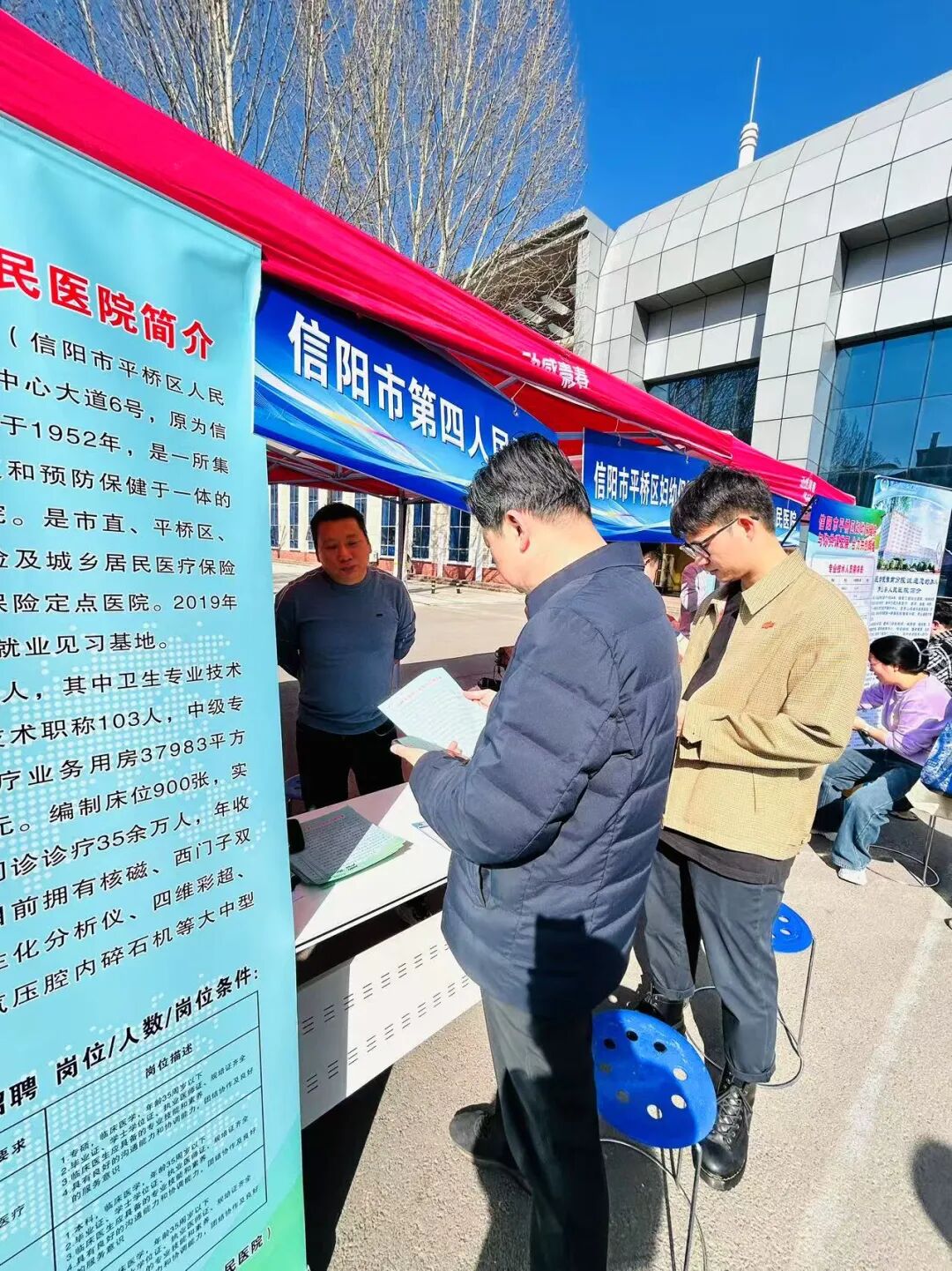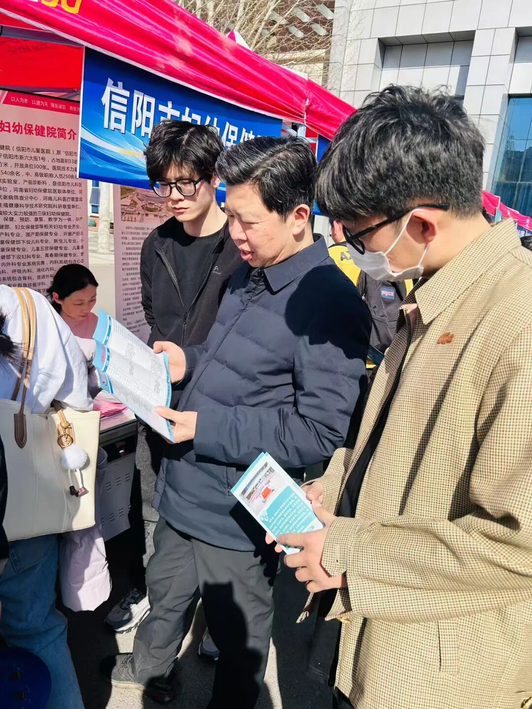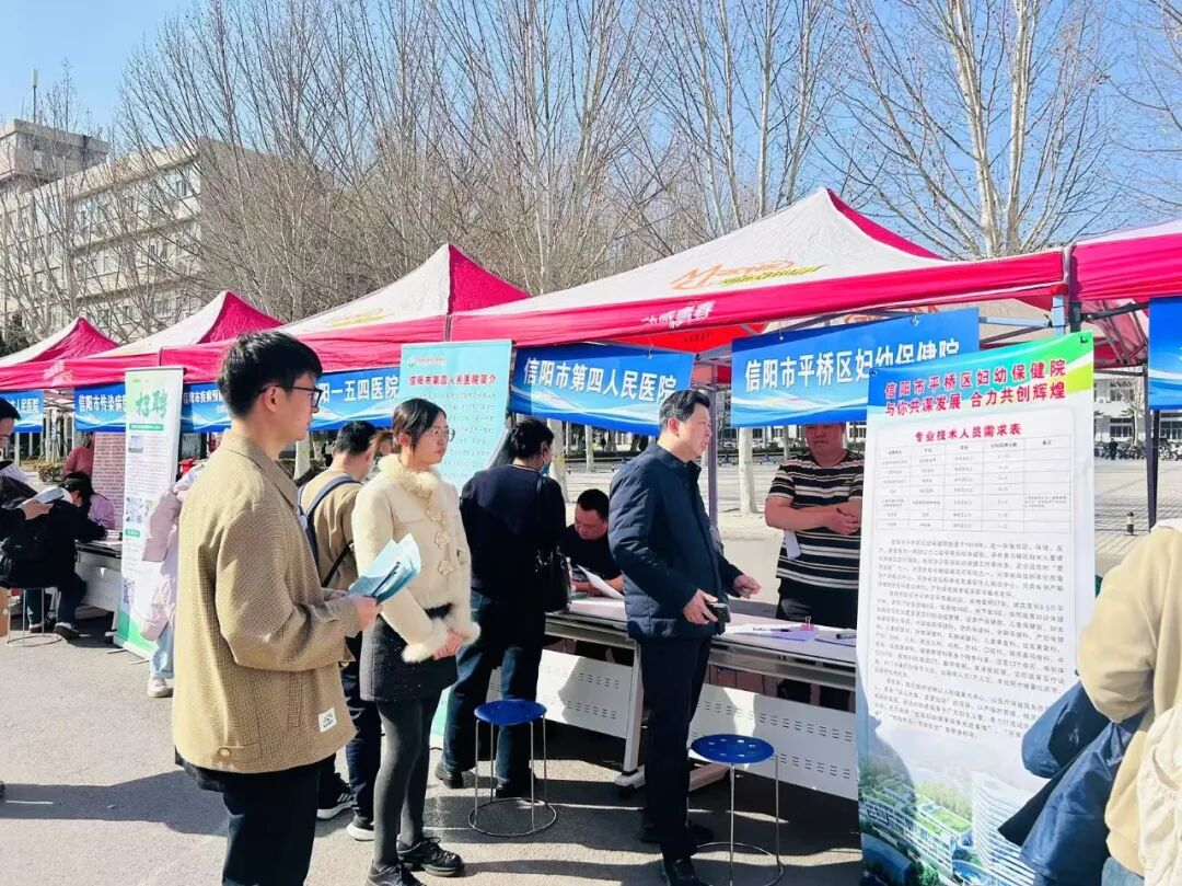 为深入贯彻落实教育部"访企拓岗促就业"专项行动,深化校企合作,拓宽毕业生就业渠道,3月21日下午,我校主动“搭台引企”,邀请信阳市中心医院、信阳市人民医院等18家市县两级医疗机构走进校园,在华亿在线手机版(大中国区)南校区五环广场前举办医疗卫生领域专场招聘会。18家医疗机构携数百余个岗位进校揽才,吸引临床医学、麻醉学、公共卫生等专业毕业生到场求职。麻醉学院党总支副书记王琰、就业办公室副主任何昊、辅导员刘慧仿到场。