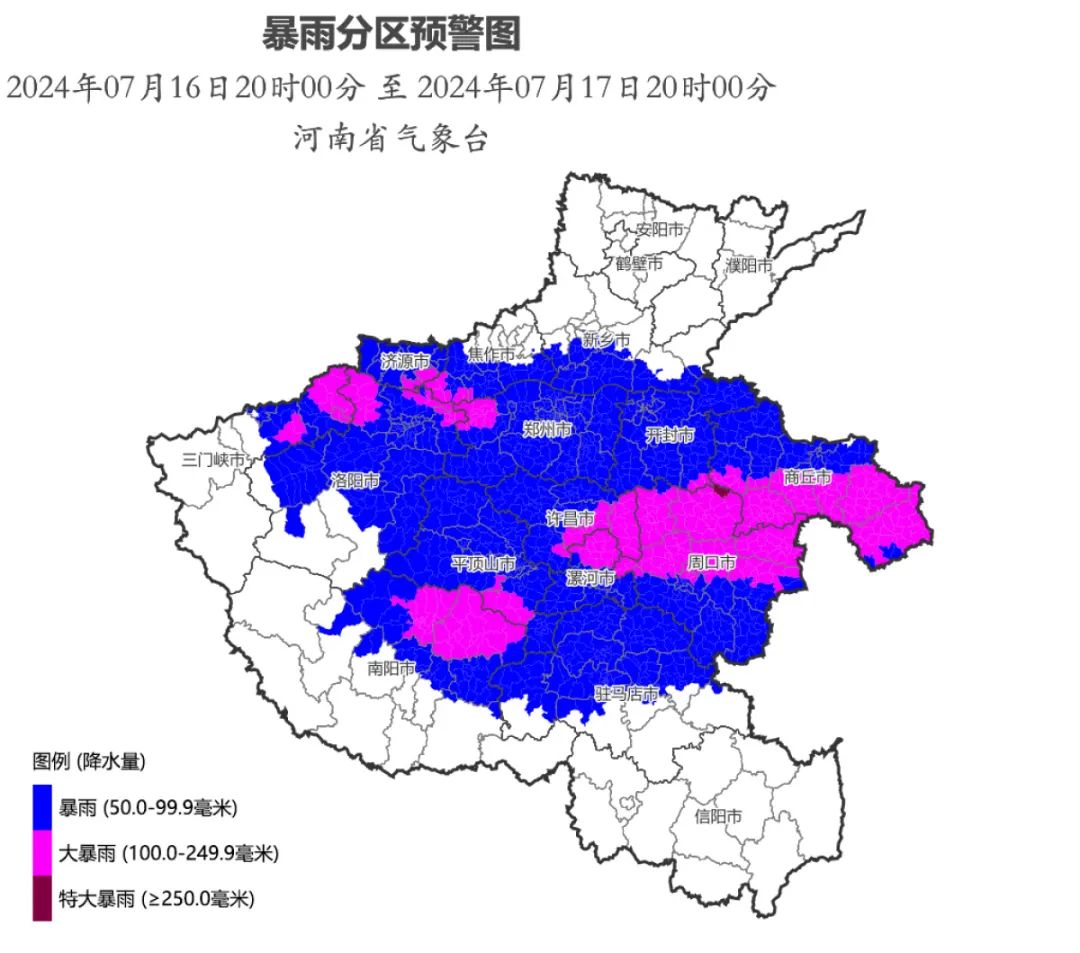 河南省气象台2024年7月16日18时30分升级发布暴雨红色预警 : 预计未来24小时,我省黄淮之间及焦作、济源、新乡南部有大到暴雨,其中济源、焦作南部、郑州西部、三门峡北部、洛阳北部、南阳北部、平顶山南部、许昌东部、漯河北部、周口北部、开封南部、商丘部分县(市、区)有大暴雨,局部特大暴雨,并伴有短时强降水(最大小时雨强50到80毫米,个别站点100毫米以上)、雷暴大风(8到10级)等强对流天气。请密切关注属地气象部门发布的最新预报信息和气象灾害预警信号,做好防范应对工作。 上述地区的相邻县(市、区)也需关注。