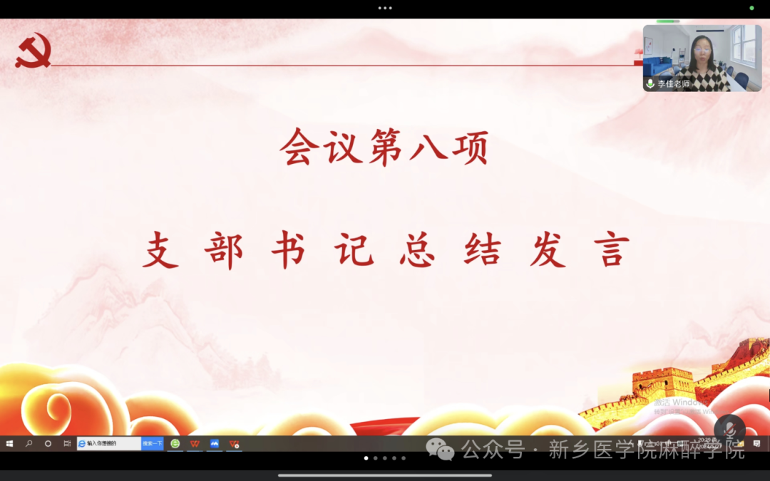 为加强基层党组织建设,为党组织吸收新鲜血液,进一步壮大党员队伍,麻醉学院学生第三党支部于5月26 日,以腾讯线上会议的形式召开了预备党员转正支部大会,会议由支部书记李佳主持。