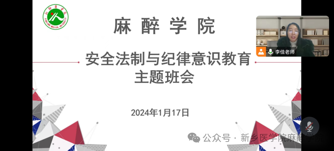 为进一步加强学生安全法制与纪律意识,提高学生的自我保护和遵纪守法观念,创设良好的学习、生活环境,更好地帮助学生健康成长,1月17日,麻醉学院召开了线上安全法制与纪律意识教育主题班会,2019级全体学生干部及实习组长参加。会议由辅导员李佳主持。