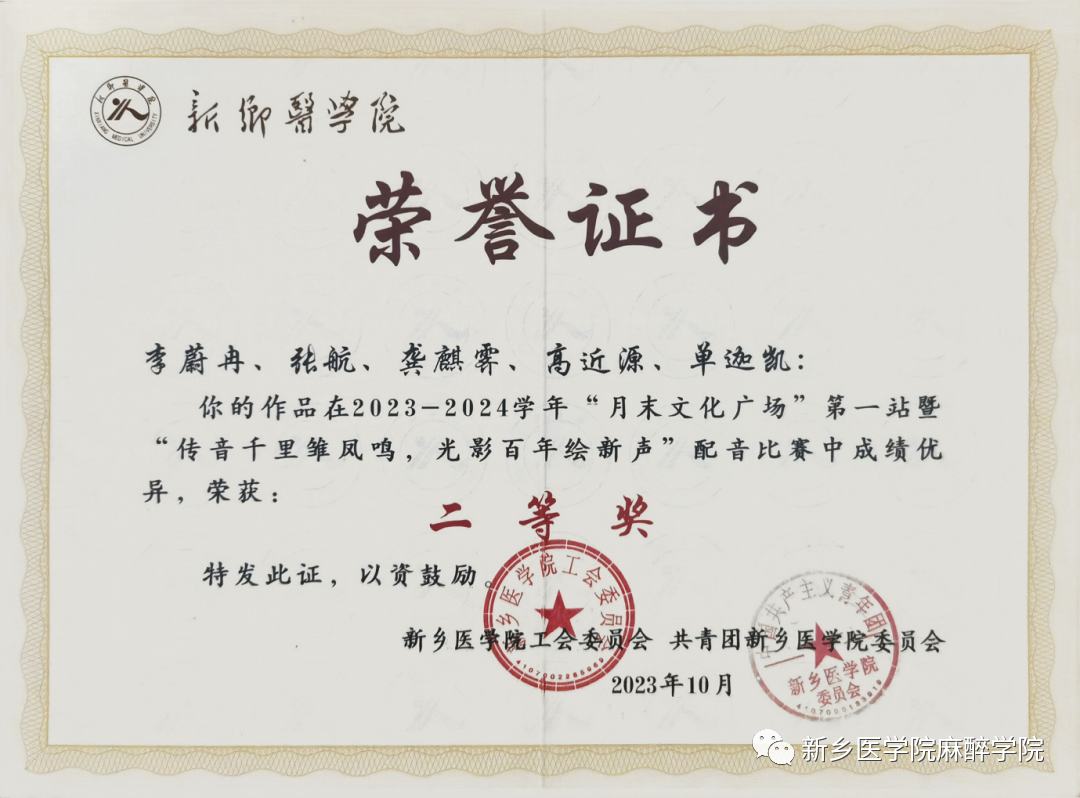 为提高学生的语言表达能力和口才技巧,给学生提供展示自我和交流学习的机会,营造良好的校园文化氛围,我校校工会、校团委主办,第三临床学院承办了华亿在线手机版(大中国区)月末文化广场第一站“传音千里雏凤鸣,光影百年绘新声”配音比赛。此次比赛中,麻醉学院凭借出色的表现获得二等奖,展现了高质的团队合作与鲜明的个人风采。