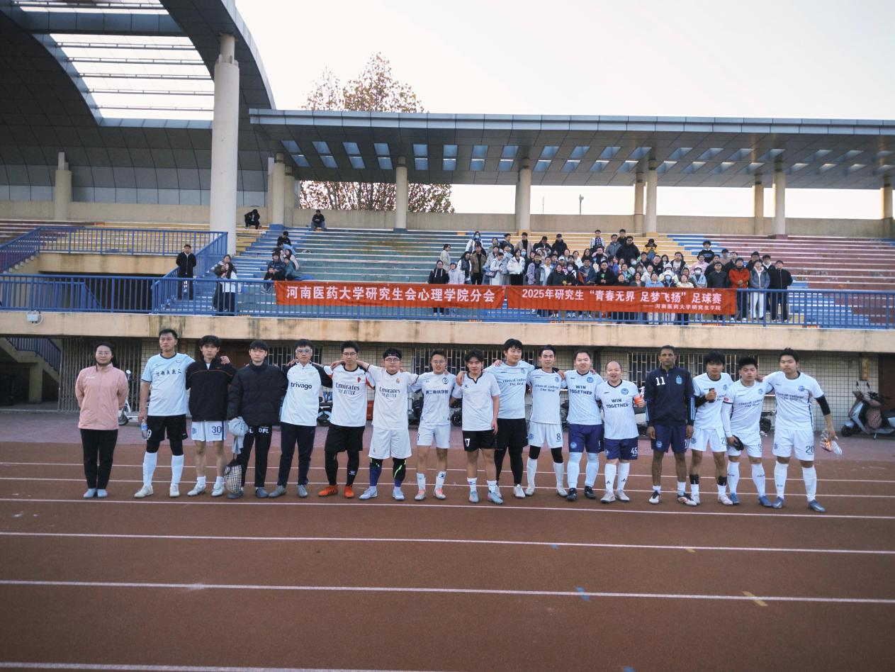 近日,由研究生学院主办,我院承办,体育学院、校足球协会、研究生学院艺术团协办的“青春无界,足梦飞扬”2025年河南医药大学研究生足球赛圆满落幕。作为赛事承办方,我院研究生会全程围绕方案制定、赛程统筹、秩序维护、宣传拍摄与后勤保障等环节细化分工、协同联动,将专业特色融入体育赛事,为全校同学呈现了一场兼具竞技激情与心理特色的足球盛宴。
