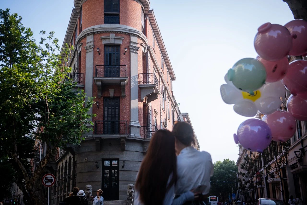 游客在武汉市汉口历史风貌区巴公房子前拍照。随着汉口历史风貌区旧城改造城市更新项目的推进,风貌区内一座座老建筑被修缮、改造,融入现代生活,焕发新的生命。