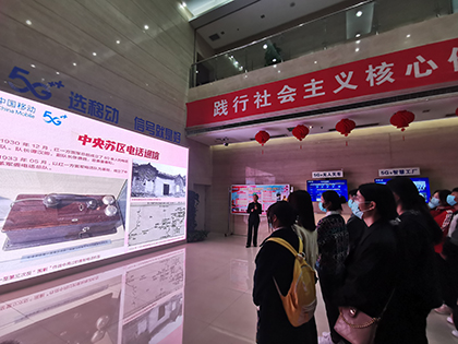 活动伊始,在移动公司讲解员的带领下全体学员们共同聆听了主题为“红色通信史”的党史学习教育宣讲。宣讲列举了建党以来党领导的通信事业的发展历程和辉煌成就,从秘密信件到无线电波,从有线电话到移动网络通讯,无论长征时的艰难困苦,还是改革开放的逐浪潮头,红色的“电波”从未消逝。从1G、 2G时代的跟随与学习,到3G、 4G时代的突破与发展,再到今天的5G时代,我国在通信领域已领跑全球。在党革命、建设、改革的百年光辉历程中,通信技术不仅是战斗力,也是创新力、竞争力、发展力、生产力,不断为人民群众的生活带来新变化。