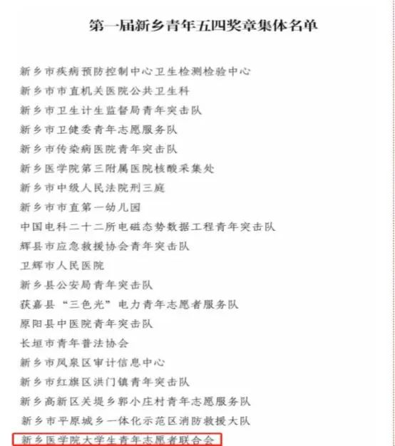 近日,共青团新乡市委、新乡市青年联合会公布了“第一届新乡青年五四奖章获奖名单”,我校大学生志愿者联合会荣获青年五四奖章集体荣誉。