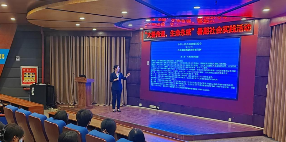 随后,基础医学院大体形态学实验室贾丽莎老师,从遗体捐献的概念、社会背景、政策法规、捐献流程等方面,给参加此次社会实践的师生进行了遗体捐献知识的普及和讲解。
