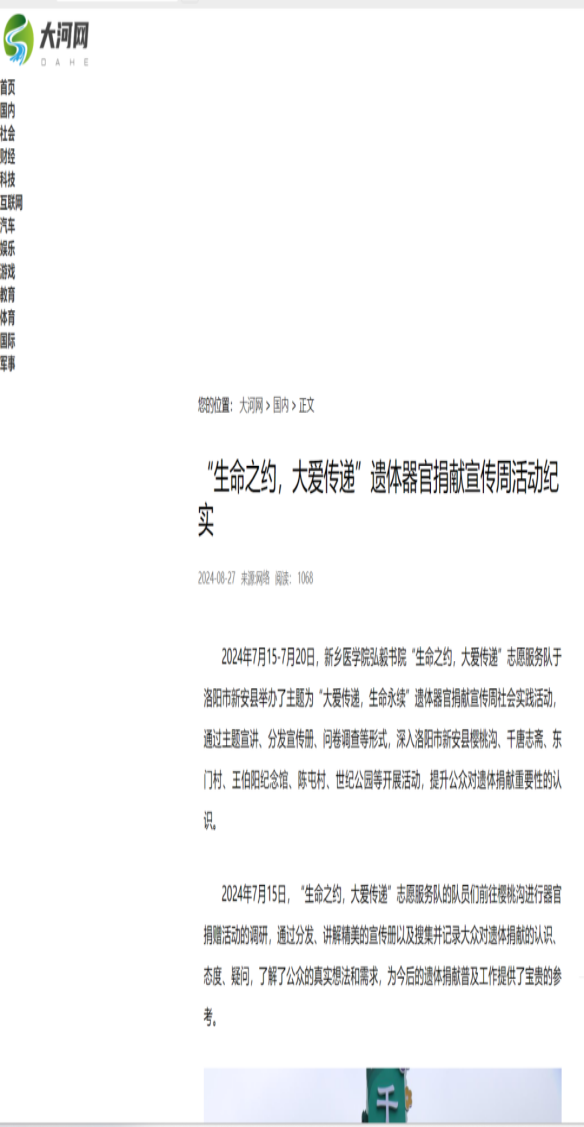为贯彻落实健康中国战略与习近平总书记“人民至上,生命至上”的崇高理念,积极传播“人道、博爱、奉献”的红十字精神,鼓励青年学子在深入基层、深入社区的社会实践中长才干、增本领,保护人民生命健康,弘扬人间大爱,促进社会文明进步。我校于2024年7月至8月开展“大爱传递,生命永续”遗体器官捐献暑期社会活动,由校团委主办,弘毅书院、基础医学院承办。经申报、评审,共组建校级实践团队20支,采取返乡实践的形式,就近就便的原则开展,覆盖郑州、洛阳、开封、新乡等17个地级市和1个省直辖县级市,实现了河南省全覆盖。
