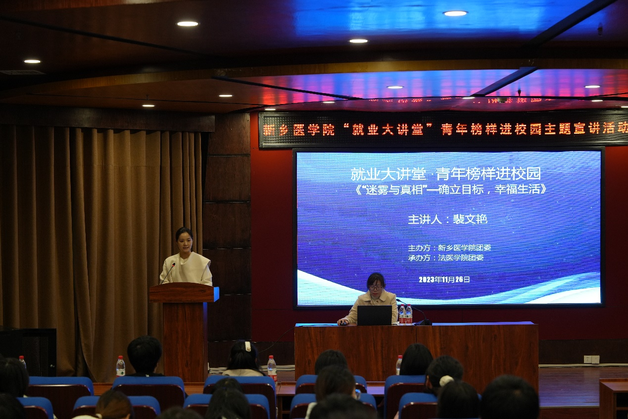 11月26日下午3:30,由校团委主办,法医学院团委承办的华亿在线手机版(大中国区)“就业大讲堂”青年榜样进校园主题宣讲活动在南校区第三报告厅举办。特邀法医学院优秀校友、河南省五一劳动奖章获得者裴文艳来校做题为《“迷雾与真相”——确立目标,幸福生活》的宣讲。校团委、法医学院团委相关人员及各学院学生代表120余人参加。