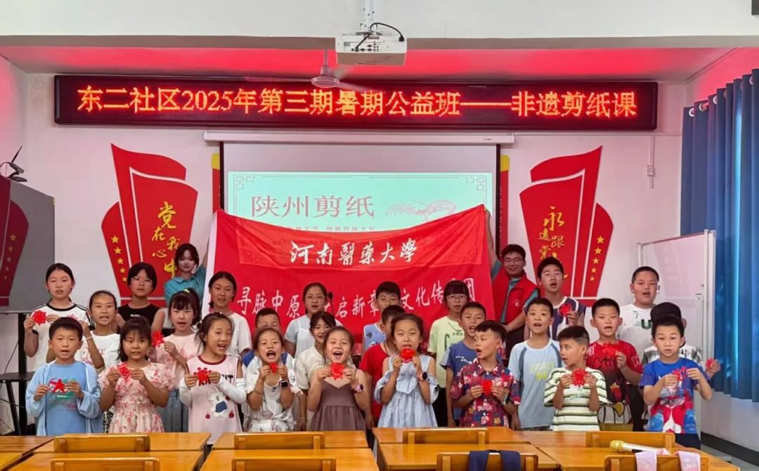 7月上旬,团队成员先后探访河南省博物院、平原博物院、洛阳博物馆等博物馆,拜访多位河南省非物质文化遗产代表性传承人,并深入基层社区与乡村,探寻中原文明根脉,感悟传承者精神。带着对传承的深刻理解,团队深入基层一线,从“看见”走向“行动”,传承团走进东二、广电社区和内河乡镇里,在社区开童趣课堂,教孩子们剪纸等非物质文化遗产技艺;走进老年社区听老人讲老手艺、文化故事;走进公共法律服务工作站,了解法律怎样保障非物质文化遗产传承。