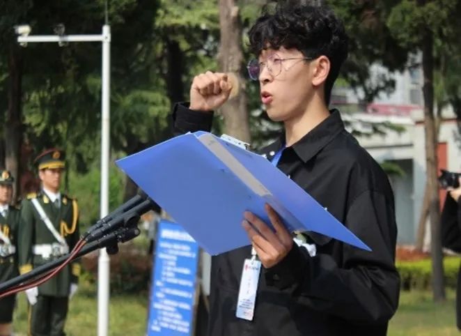 学生代表李存森带领全体志愿者庄严宣誓,言辞铿锵,澎湃激昂。宣誓完毕,国旗护卫队代表在庄重的《献花曲》中向革命烈士敬献花篮,全体人员在烈士纪念碑前鞠躬致敬、肃立默哀。