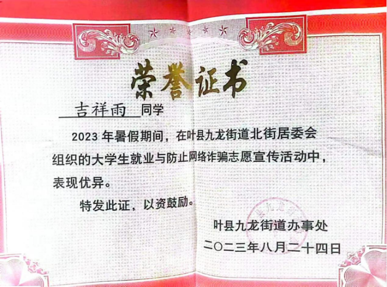 (支部团员吉祥雨在返家乡志愿服务活动中获得的证书)