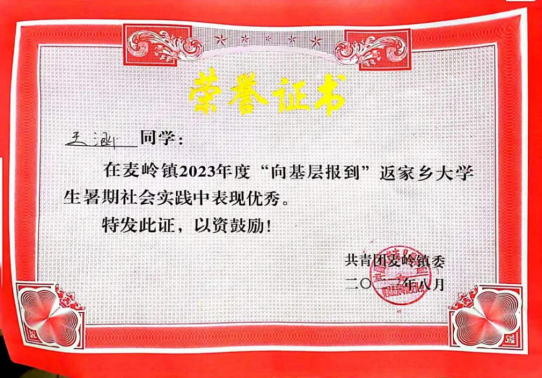 (支部团员王涵在家乡获得的2023年度“向基层报到”返家乡社会实践证书)