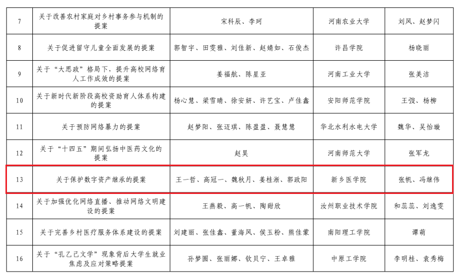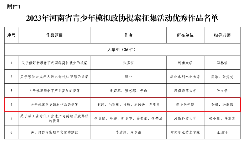 近期,由共青团河南省委办公室、河南省学生联合秘书处联合举办的2023年“河南省青少年模拟政协提案征集活动”表彰情况公布。全省大学生、中学生和各行业青年共计 9 万余人(团队)积极参与,征集活动共评选出优秀模拟政协提案50件(大学组36件中学组8件、职业青年组6件)。我校《关于规范历史题材作品的提案》和 《关于保护数字资产继承的提案》2件作品获优秀模拟政协提案。