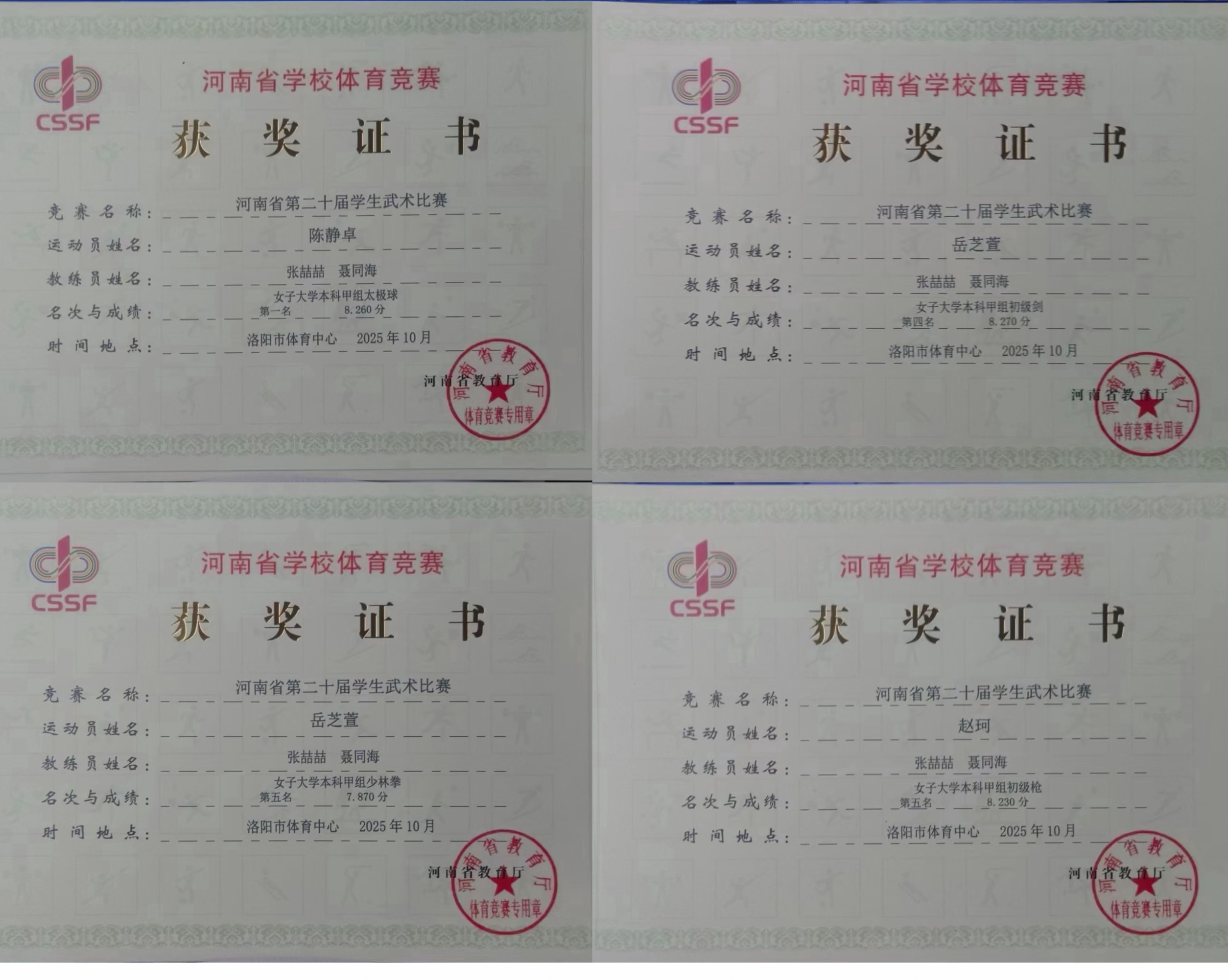 我校体育学院聂同海、张喆喆两位教师担任教练,率校武术队5名运动员出征。赛场上,我校选手奋勇争先、全力以赴,经过四天激烈比拼,成绩喜人:峻极书院陈静卓荣获女子大学本科甲组太极球第一名;麻醉学院岳芝萱分获女子大学本科甲组初级剑第四名与少林拳第五名;第一临床学院赵珂夺得女子大学本科甲组初级枪第五名。最终,我校代表队在女子大学本科甲组团体总分中位列第七。