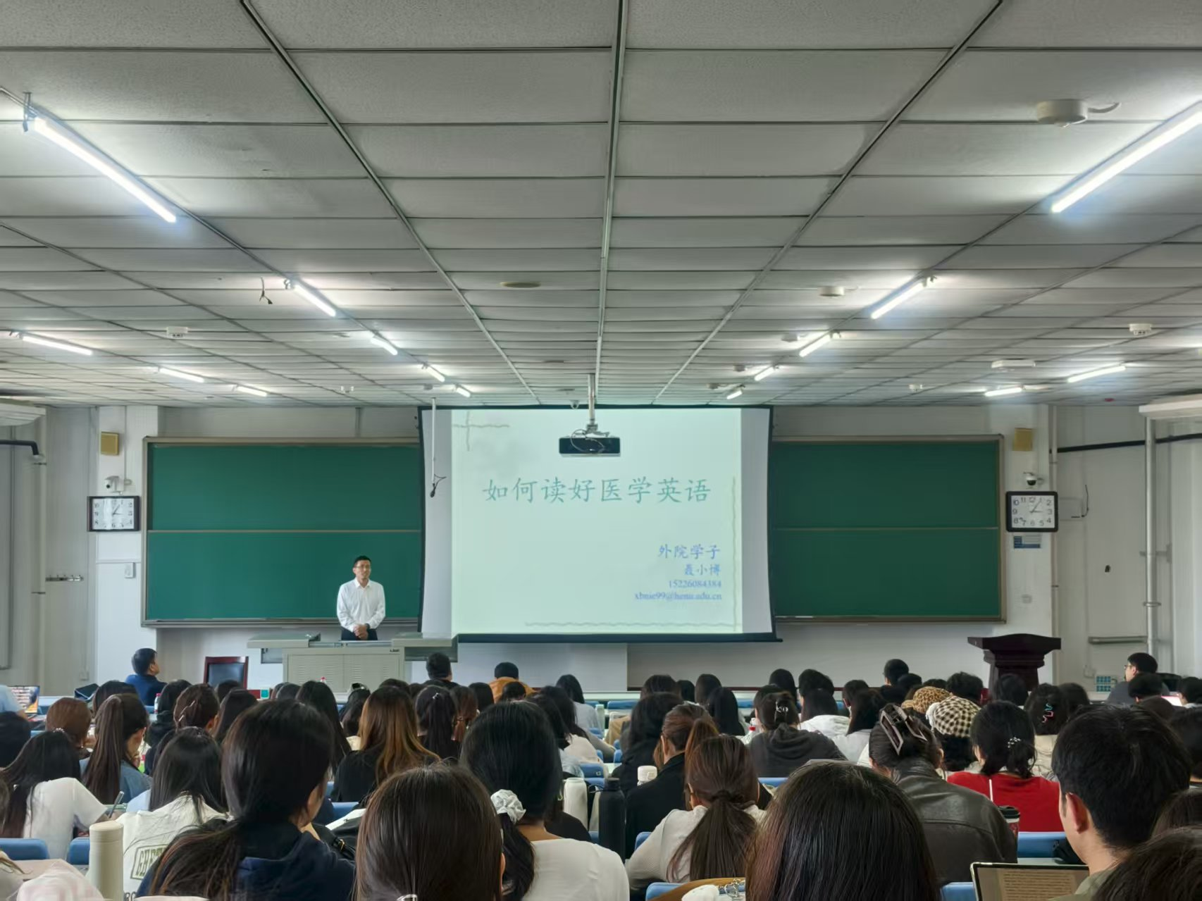 聂小博以自己的成长之路为出发点,为同学们详细介绍从学校到职场的各种经历,提醒同学们做好学业和职业规划;学精医学英语,提高专业素养;自律自强,珍惜时间;积极提问,踏实进步。他还鼓励同学们辅修或自学专业,积极拓展知识面,利用学校资源,为自己的未来铺路。