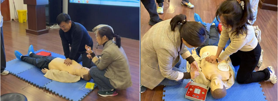 在理论学习之后,王丽娟老师在志愿者的协助下,指导师生分组进行了心肺复苏实操练习。课堂气氛热烈,大家积极参与、互相配合。在反复练习中,同学们亲身体验到持续胸外按压的体力消耗之大,纷纷表示“短短两分钟就已气喘吁吁,真正体会到医护人员的不易与伟大”。此次培训不仅让师生掌握了基本的急救技能,也进一步提升了对生命的敬畏与责任意识。